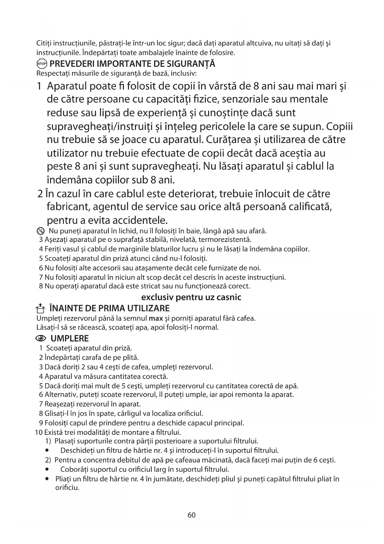 15 Pentru 2 ceşti, apăsaţi o dată butonul, pentru 4 ceşti, de două ori, pentru 5-10 ceşti, de trei ori.