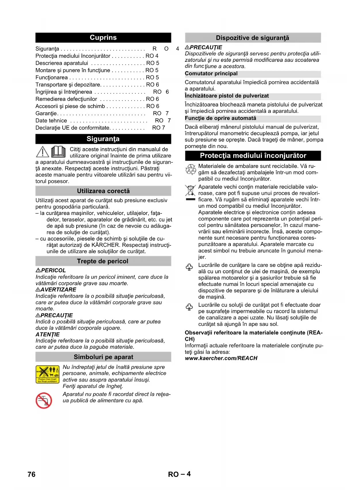 93 dB(A) Zastrzega się prawo wprowadzania zmian technicznych. Deklaracja zgodności UE Produkt: Myjka wysokociśnieniowa Typ: 1.673-xxx Obowiązujące dyrektywy UE 2011/65/UE 2000/14/WE 2006/42/WE (+2009/127/WE) 2014/30/UE Zastosowane normy zharmonizowane EN 60335–1 EN 60335–2–79 EN 62233: 2008 EN 55014–1:2017 EN 55014–2: 2015 EN 61000–3–2: 2014 EN 61000–3–3: 2013 EN IEC 63000: 2018 Zastosowana metoda oceny zgodności 2000/14/WE: Załącznik V Poziom mocy akustycznej dB(A) Zmierzony: 90 Gwarantowany: 93 Chairman of the Board of Management Director Regulatory Affairs & Certification 75PL– 4 Citiţi aceste instrucţiuni din manualul de utilizare original înainte de prima utilizare a aparatului dumneavoastră şi instrucţiunile de siguran- ţă anexate. Respectaţi aceste instrucţiuni. Păstraţi aceste manuale pentru viitoarele utilizări sau pentru vii- torul posesor. Utilizaţi acest aparat de curăţat sub presiune exclusiv pentru gospodăria particulară. – la curăţarea maşinilor, vehiculelor, utilajelor, faţa- delor, teraselor, aparatelor de grădinărit, etc. cu jet de apă sub presiune (în caz de nevoie cu adăuga- rea de soluţie de curăţat). – cu accesoriile, piesele de schimb şi soluţiile de cu- răţat autorizaţi de KÄRCHER. Respectaţi instrucţi- unile de utilizare ale soluţiilor de curăţat. PERICOL Indicaţie referitoare la un pericol iminent, care duce la vătămări corporale grave sau moarte. 몇 AVERTIZARE Indicaţie referitoare la o posibilă situaţie periculoasă, care ar putea duce la vătămări corporale grave sau moarte. 몇 PRECAUŢIE Indică o posibilă situaţie periculoasă, care ar putea duce la vătămări corporale uşoare. ATENŢIE Indicaţie referitoare la o posibilă situaţie periculoasă, care ar putea duce la pagube materiale. 몇 PRECAUŢIE Dispozitivele de siguranţă servesc pentru protecţia utili- zatorului şi nu este permisă modificarea sau scoaterea din func ţiune a acestora. Comutatorul aparatului împiedică pornirea accidentală a aparatului. Închizătoarea blochează maneta pistolului de pulverizat şi împiedică pornirea accidentală a aparatului. Dacă eliberaţi mânerul pistolului manual de pulverizat, întrerupătorul manometric decuplează pompa, iar jetul sub presiune se opreşte. Dacă trageţi de mâner, pompa porneşte din nou. Observaţii referitoare la materialele conţinute (REA- CH) Informaţii actuale referitoare la materialele conţinute pu- teţi găsi la adresa: www.kaercher.com/REACH Cuprins Siguranţa . . . . . . . . . . . . . . . . . . . . . . . . . . . .RO4 Protecţia mediului înconjurător . . . . . . . . . . . RO 4 Descrierea aparatului . . . . . . . . . . . . . . . . . . RO 5 Montare şi punere în funcţiune . . . . . . . . . . . RO 5 Funcţionarea . . . . . . . . . . . . . . . . . . . . . . . . . RO 5 Transportare şi depozitare. . . . . . . . . . . . . . . RO 6 Îngrijirea şi întreţinerea . . . . . . . . . . . . . . . . . RO 6 Remedierea defecţiunilor . . . . . . . . . . . . . . . RO 6 Accesorii şi piese de schimb . . . . . . . . . . . . . RO 6 Garanţie. . . . . . . . . . . . . . . . . . . . . . . . . . . . . RO 7 Date tehnice . . . . . . . . . . . . . . . . . . . . . . . . . RO7 Declaraţie UE de conformitate. . . . . . . . . . . . RO 7 Siguranţa Utilizarea corectă Trepte de pericol Simboluri pe aparat Nu îndreptaţi jetul de înaltă presiune spre persoane, animale, echipamente electrice active sau asupra aparatului însuşi. Feriţi aparatul de îngheţ. Aparatul nu poate fi racordat direct la reţea- ua publică de alimentare cu apă. Dispozitive de siguranţă Comutator principal Închizătoare pistol de pulverizat Funcţie de oprire automată Protecţia mediului înconjurător Materialele de ambalare sunt reciclabile. Vă ru- găm să dezafectaţi ambalajele într-un mod com- patibil cu mediul înconjurător. Aparatele vechi conţin materiale reciclabile valo- roase, care pot fi supuse unui proces de revalori- ficare. Vă rugăm să eliminaţi aparatele vechi într- un mod compatibil cu mediul înconjurător. Aparatele electrice și electronice conțin adesea componente care pot reprezenta un potențial peri- col pentru sănătatea persoanelor, în cazul mane- vrării sau eliminării incorecte. Însă, aceste compo- nente sunt necesare pentru funcționarea cores- punzătoare a aparatului. Aparatele marcate cu acest simbol nu trebuie aruncate în gunoiul mena- jer. Lucrările de curăţare la care se obţine apă rezidu- ală cu un conţinut de ulei de maşină, de exemplu spălarea motoarelor şi a şasiurilor trebuie să fie efectuate numai în locuri special amenajate cu dispozitive de separare şi de înlăturare a uleiului de maşină. Lucrările cu soluţii de curăţat pot fi efectuate doar pe suprafeţe impermeabile cu racord la sistemul de canalizare a apei uzate. Nu lăsaţi soluţiile de curăţat să ajungă în ape sau sol. 76 RO– 5 Setul de livrare a aparatului (în funcţie de model) este ilustrat pe ambalaj. Acest manual de utilizare descrie toate opţiunile posibile. Pentru figuri, vezi paginile cu grafice 1 Racord de presiune înaltă 2 Comutatorul aparatului „0/OFF“ / „I/ON“ 3 Spaţiu de depozitare pentru furtunul de presiune 4 Mâner pentru transport 5 Spaţiu de depozitare pentru lance 6 Racord de apă cu sită inclusă 7 Piesă de cuplare pentru conexiunea de apă 8 Cablu de reţea cu ştecher 9 Plăcuţa de tip 10 Pistol de pulverizat sub presiune 11 Închizătoare pistol de pulverizat 12 Furtun de înaltă presiune 13 Cleme pentru furtunul de înaltă presiune 14 Lancea cu duză cvadruplă Pentru operaţiuni de curăţare normale. 15 Lance cu freză pentru murdărie Pentru murdărie persistentă Pentru figuri, vezi paginile cu grafice Figură Înainte de punerea în funcţiune montaţi piesele ne- fixate, livrate împreună cu aparatul. Amplasaţi aparatul pe o suprafaţă plană. Figură Scoateţi clemele pistolului de