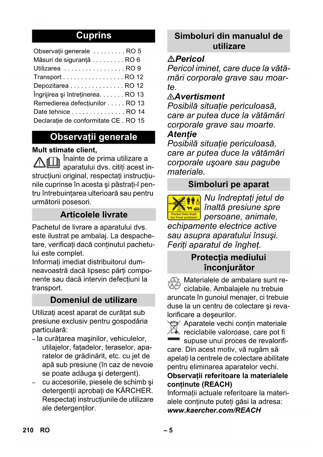 EN 61000–3–3: 2008 EN 62233: 2008 Zastosowana metoda oceny zgodno- ści 2000/14/WE: Załącznik V Poziom mocy akustycznej dB(A) Zmierzony: 87 Gwarantowany:90 CEO Head of Approbation Winnenden, 2013/07/01 209PL– 5 Mult stimate client, Înainte de prima utilizare a aparatului dvs. citiţi acest in- strucţiuni original, respectaţi instrucţiu- nile cuprinse în acesta şi păstraţi-l pen- tru întrebuinţarea ulterioară sau pentru următorii posesori. Pachetul de livrare a aparatului dvs. este ilustrat pe ambalaj. La despache- tare, verificaţi dacă conţinutul pachetu- lui este complet. Informaţi imediat distribuitorul dum- neavoastră dacă lipsesc părţi compo- nente sau dacă intervin defecţiuni la transport. Utilizaţi acest aparat de curăţat sub presiune exclusiv pentru gospodăria particulară: – la curăţarea maşinilor, vehiculelor, utilajelor, faţadelor, teraselor, apa- ratelor de grădinărit, etc. cu jet de apă sub presiune (în caz de nevoie se poate adăuga şi detergent). – cu accesoriile, piesele de schimb şi detergenţii aprobaţi de KÄRCHER. Respectaţi instrucţiunile de utilizare ale detergenţilor. Pericol Pericol iminet, care duce la vătă- mări corporale grave sau moar- te. 몇 Avertisment Posibilă situaţie periculoasă, care ar putea duce la vătămări corporale grave sau moarte. Atenţie Posibilă situaţie periculoasă, care ar putea duce la vătămări corporale uşoare sau pagube materiale. Nu îndreptaţi jetul de înaltă presiune spre persoane, animale, echipamente electrice active sau asupra aparatului însuşi. Feriţi aparatul de îngheţ. Materialele de ambalare sunt re- ciclabile. Ambalajele nu trebuie aruncate în gunoiul menajer, ci trebuie duse la un centru de colectare şi reva- lorificare a deşeurilor. Aparatele vechi conţin materiale reciclabile valoroase, care pot fi supuse unui proces de revalorifi- care. Din acest motiv, vă rugăm să apelaţi la centrele de colectare abilitate pentru eliminarea aparatelor vechi. Observaţii referitoare la materialele conţinute (REACH) Informaţii actuale referitoare la materi- alele conţinute puteţi găsi la adresa: www.kaercher.com/REACH Cuprins Observaţii generale . . . . . . . . . RO 5 Măsuri de siguranţă . . . . . . . . . RO 6 Utilizarea . . . . . . . . . . . . . . . . . RO 9 Transport . . . . . . . . . . . . . . . . . RO 12 Depozitarea . . . . . . . . . . . . . . . RO 12 Îngrijirea şi întreţinerea. . . . . . . RO 13 Remedierea defecţiunilor . . . . . RO 13 Date tehnice . . . . . . . . . . . . . . . RO 14 Declaraţie de conformitate CE . RO 15 Observaţii generale Articolele livrate Domeniul de utilizare Simboluri din manualul de utilizare Simboluri pe aparat Protecţia mediului înconjurător 210 RO– 6 În fiecare ţară sunt valabile condiţiile de garanţie publicate de distribuitorul nostru din ţara respectivă. Eventuale defecţiuni ale acestui aparat, care sur- vin în perioada de garanţie şi care sunt rezultatul unor defecte de fabricaţie sau de material, vor fi remediate gratu- it. Pentru a putea beneficia de garan- ţie, prezentaţi-vă cu chitanţa de cum- părare la magazin sau la cea mai apro- piată unitate de service autorizată. (Pentru adresă vedeţi pagina din spa- te) Pericol Nu apucaţi niciodată fişa de alimentare şi priza având mâinile ude. Nu puneţi aparatul în funcţiu- ne dacă este deteriorat cablul de alimentare de la reţea sau elemente importante ale apa- ratului, precum de ex. furtunul de presiune, pistolul de pul- verizare sau dispozitivele de siguranţă. Înainte de fiecare utilizare ve- rificaţi cablul de reţea şi şte- cherul, să nu aibă defecţiuni. Cablul de reţea deteriorat tre- buie înlocuit neîntârziat într- un atelier electric / service pentru clienţi autorizat. Verificaţi furtunurile de presi- une înainte de fiecare utiliza- re. Înlocuiţi-le neîntârziat pe cele care prezintă defecţiuni. Este interzisă funcţionarea în zone cu pericol de explozie. La utilizarea aparatului în zone periculoase (de ex. reci- piente de combustibil) se vor respecta instrucţiunile de se- curitate corespunzătoare. Jeturile sub presiune pot fi periculoase în cazul utilizării neconforme. Jetul nu trebuie îndreptat spre persoane, ani- male, echipamente electrice active sau asupra aparatului însuşi. Nu îndreptaţi jetul de presiune spre dvs. înşivă sau spre altci- neva, pentru a curăţa îmbrăcă- mintea sau încălţămintea. Nu stropiţi obiecte ce conţin materiale periculoase (de ex. azbest). Cauciucurile vehiculelor/ven- tilele lor pot fi deteriorate de jetul sub presiune şi se pot fi- sura. Primul semn este o de- colorare a cauciucului. Anve- lopele/supapele anvelopelor deteriorate pun în pericol via- ţa persoanelor. La curăţare păstraţi o distanţă minimă de cel puţin 30 cm! Pericol de explozie! Nu pulverizaţi lichide inflamabile. Nu se vor aspira niciodată li- chide conţinând solvenţi, di- zolvanţi sau acizi nediluaţi! În această categorie intră de ex. benzina, diluantul pentru vop- sea, uleiul. Ceaţa formată la stropire este inflamabilă, ex- plozivă şi toxică. Nu folosiţi acetonă, acizi nediluaţi şi di- zolvanţi, căci atacă materiale- le folosite la aparat. Garanţie Măsuri de siguranţă 211RO– 7 몇 Avertisment Ştecherul şi cuplajul unui pre- lungitor trebuie să fie etanşe la apă şi nu au voie să se afle în apă. Cuplajul nu trebuie lăsat pe podea. Vă recomandăm să utilizaţi un tambur de cablu, pentru a asigura ca ştecherele să se afle la cel puţin 60 mm deasupra podelei. Cablurile prelungitoare nepo- trivite pot fi periculoase. Pen- tru aer liber se vor utiliza nu- mai prelungitoare admise şi marcate corespunzător, cu secţiune suficientă: 1 - 10 m: 1,5 mm