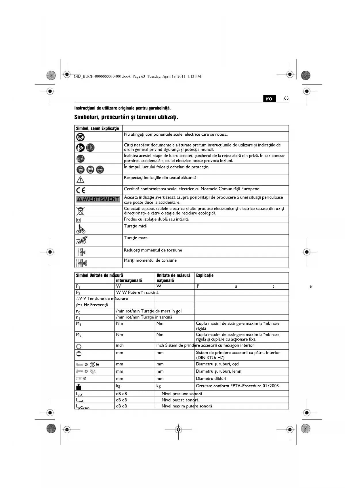 Instrucţiuni de utilizare originale pentru şurubelniţă. Simboluri, prescurtări şi termeni utilizaţi. Simbol, semn Explicaţie Nu atingeţi componentele sculei electrice care se rotesc. Citiţi neapărat documentele alăturate precum instrucţiunile de utilizare şi indicaţiile de ordin general privind siguranţa şi potecţia muncii. Înaintea acestei etape de lucru scoateţi ştecherul de la reţea afară din priză. În caz contrar pornirea accidentală a sculei electrice poate provoca leziuni. În timpul lucrului folosiţi ochelari de protecţie. Respectaţi indicaţiile din textul alăturat! Certifică conformitatea sculei electrice cu Normele Comunităţii Europene. Această indicaţie avertizează asupra posibilităţii de producere a unei situaţii periculoase care poate duce la accidentare. Colectaţi separat sculele electrice şi alte produse electronice şi electrice scoase din uz şi direcţionaţi-le către o staţie de reciclare ecologică. Produs cu izolaţie dublă sau întărită Turaţie mică Turaţie mare Reduceţi momentul de torsiune Măriţi momentul de torsiune Simbol Unitate de măsură internaţională Unitate de măsură naţională Explicaţie