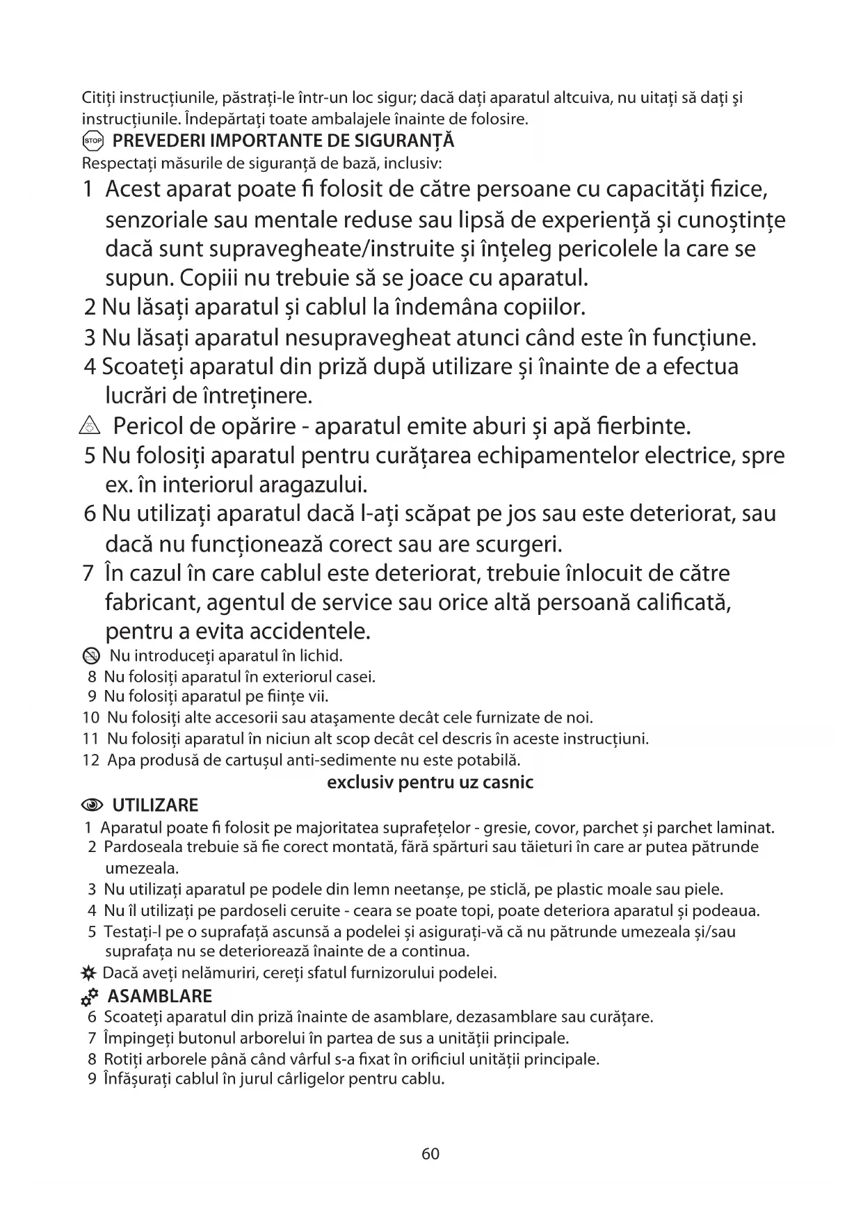 4 Nu îl utilizaţi pe pardoseli ceruite - ceara se poate topi, poate deteriora aparatul și podeaua.