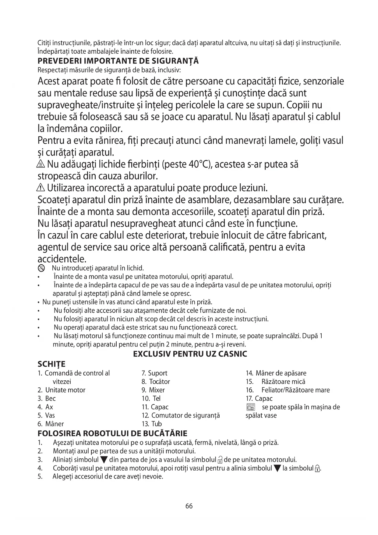 • Nu folosiți degetele sau tacâmuri pentru a împinge alimentele – folosiți doar mânerul de apăsare.