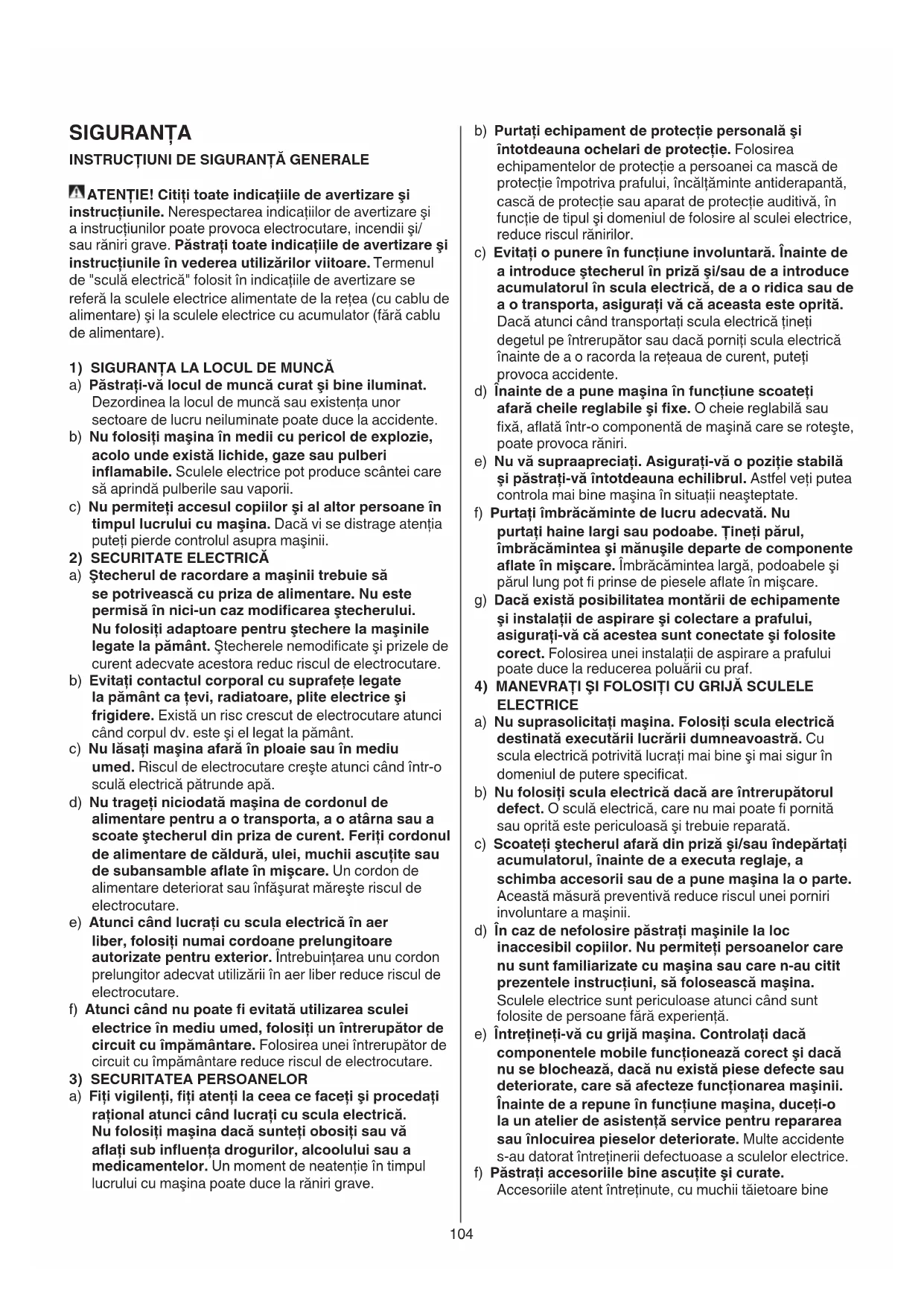 SIGURANŢA INSTRUCŢIUNI DE SIGURANŢĂ GENERALE ATENŢIE! Citiţi toate indicaţiile de avertizare şi