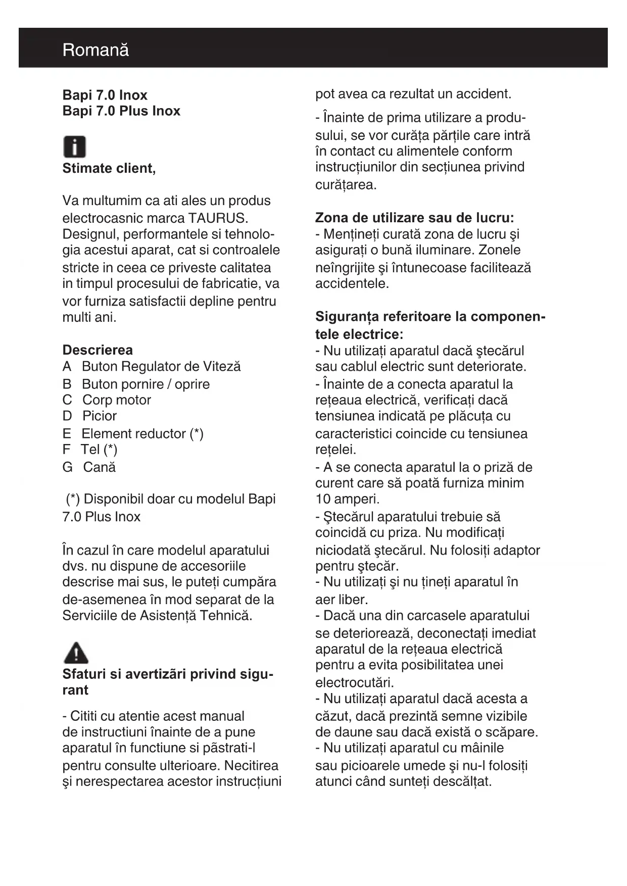 MANUAL DE UTILIZARE Bapi 7.0 Plus Inox TAURUS