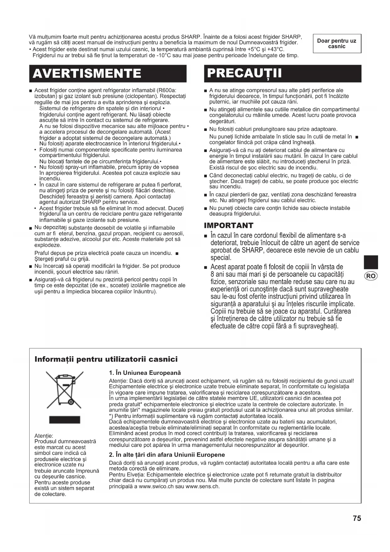 Vă mulţumim foarte mult pentru achiziţionarea acestui produs SHARP. Înainte de a folosi acest frigider SHARP,