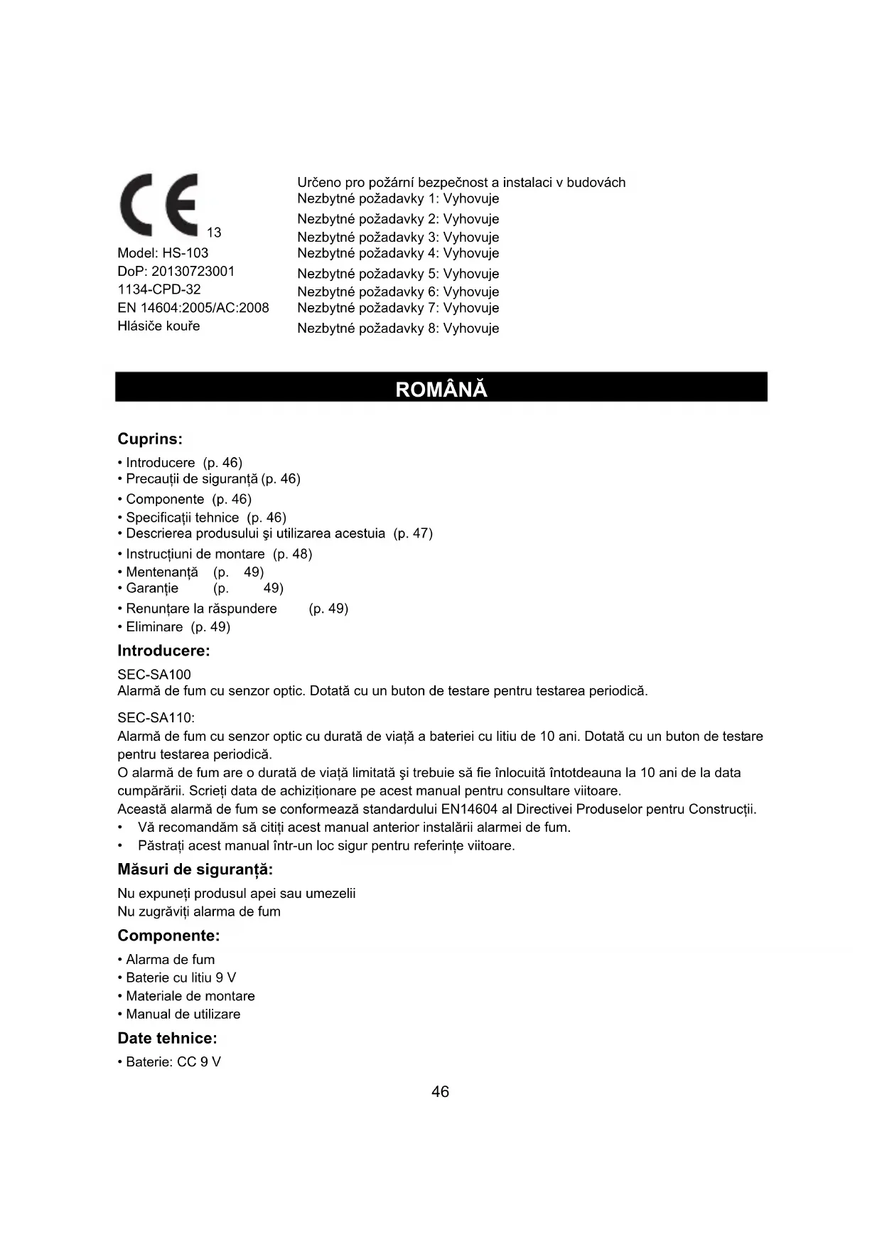 Această alarmă de fum se conformează standardului EN14604 al Directivei Produselor pentru Construcţii.