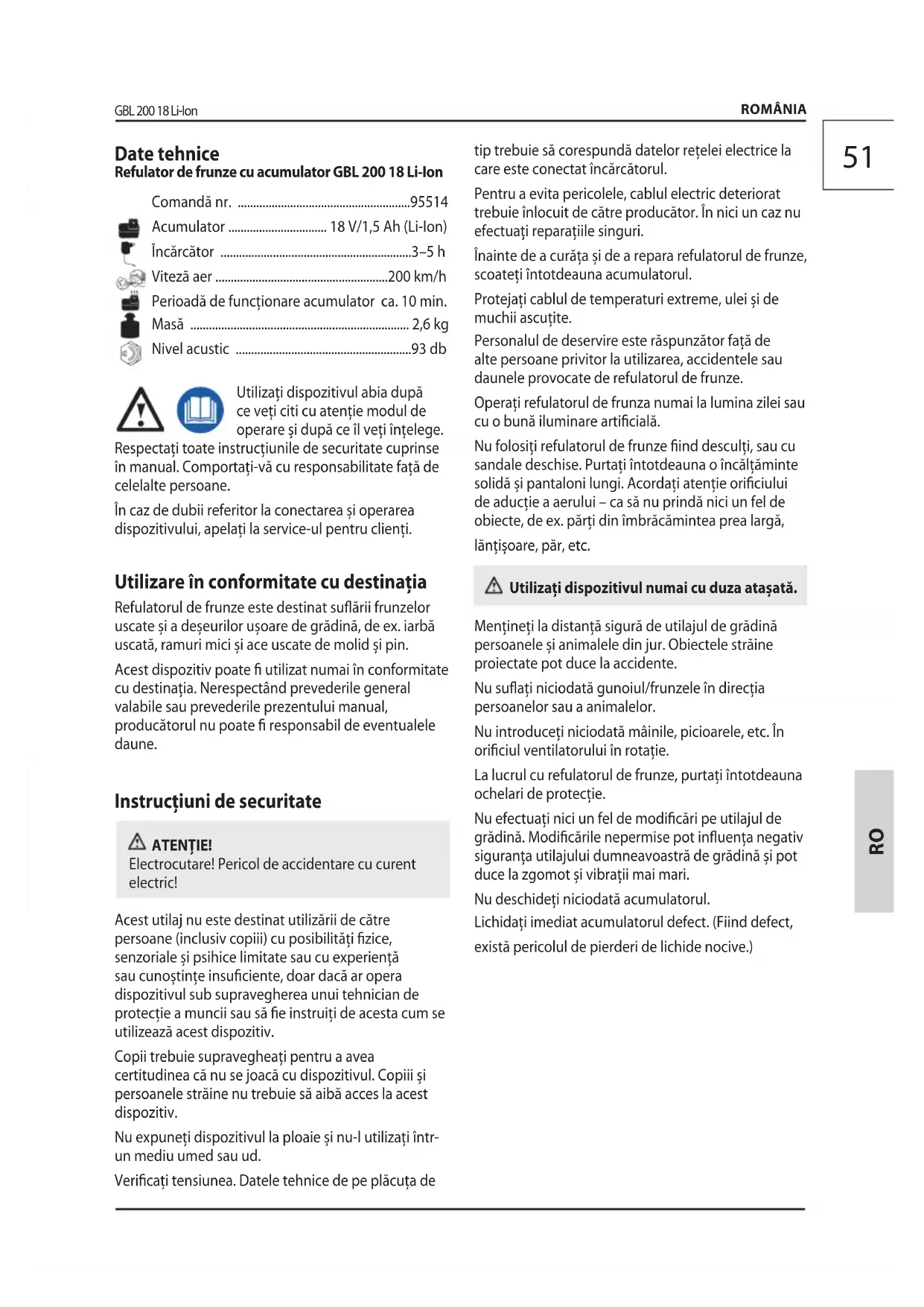 - Utilizai dispozitivul abia după ce vei citi cu atenie modul de operare și după ce îl vei înelege. Respectai toate instruciunile de securitate cuprinse în manual. Comportai-vă cu responsabilitate faă de celelalte persoane. În caz de dubii referitor la conectarea și operarea dispozitivului, apelai la service-ul pentru clieni. Utilizare în conformitate cu destinaia Refulatorul de frunze este destinat suării frunzelor uscate și a deșeurilor ușoare de grădină, de ex. iarbă uscată, ramuri mici și ace uscate de molid și pin. Acest dispozitiv poate utilizat numai în conformitate cu destinaia. Nerespectând prevederile general valabile sau prevederile prezentului manual, producătorul nu poate responsabil de eventualele daune. Instruciuni de securitate ATENIE! Electrocutare! Pericol de accidentare cu curent electric! Acest utilaj nu este destinat utilizării de către persoane (inclusiv copiii) cu posibilităi zice, senzoriale și psihice limitate sau cu experienă sau cunoștine insuciente, doar dacă ar opera dispozitivul sub supravegherea unui tehnician de protecie a muncii sau să e instruii de acesta cum se utilizează acest dispozitiv. Copii trebuie supravegheai pentru a avea certitudinea că nu se joacă cu dispozitivul. Copiii și persoanele străine nu trebuie să aibă acces la acest dispozitiv. Nu expunei dispozitivul la ploaie și nu-l utilizai într- un mediu umed sau ud. Vericai tensiunea. Datele tehnice de pe plăcua de tip trebuie să corespundă datelor reelei electrice la care este conectat încărcătorul. Pentru a evita pericolele, cablul electric deteriorat trebuie înlocuit de către producător. În nici un caz nu efectuai reparaiile singuri. Înainte de a curăa și de a repara refulatorul de frunze, scoatei întotdeauna acumulatorul. Protejai cablul de temperaturi extreme, ulei și de muchii ascuite. Personalul de deservire este răspunzător faă de alte persoane privitor la utilizarea, accidentele sau daunele provocate de refulatorul de frunze. Operai refulatorul de frunza numai la lumina zilei sau cu o bună iluminare articială. Nu folosii refulatorul de frunze ind desculi, sau cu sandale deschise. Purtai întotdeauna o încălăminte solidă și pantaloni lungi. Acordai atenie oriciului de aducie a aerului – ca să nu prindă nici un fel de obiecte, de ex. pări din îmbrăcămintea prea largă, lănișoare, păr, etc. Utilizai dispozitivul numai cu duza atașată. Meninei la distană sigură de utilajul de grădină persoanele și animalele din jur. Obiectele străine proiectate pot duce la accidente. Nu suai niciodată gunoiul/frunzele în direcia persoanelor sau a animalelor. Nu introducei niciodată mâinile, picioarele, etc. În oriciul ventilatorului în rotaie. La lucrul cu refulatorul de frunze, purtai întotdeauna ochelari de protecie. Nu efectuai nici un fel de modicări pe utilajul de grădină. Modicările nepermise pot inuena negativ sigurana utilajului dumneavoastră de grădină și pot duce la zgomot și vibraii mai mari. Nu deschidei niciodată acumulatorul. Lichidai imediat acumulatorul defect. (Fiind defect, există pericolul de pierderi de lichide nocive.) Date tehnice Refulator de frunze cu acumulator GBL 200 18 Li-Ion Comandă nr p. 9551