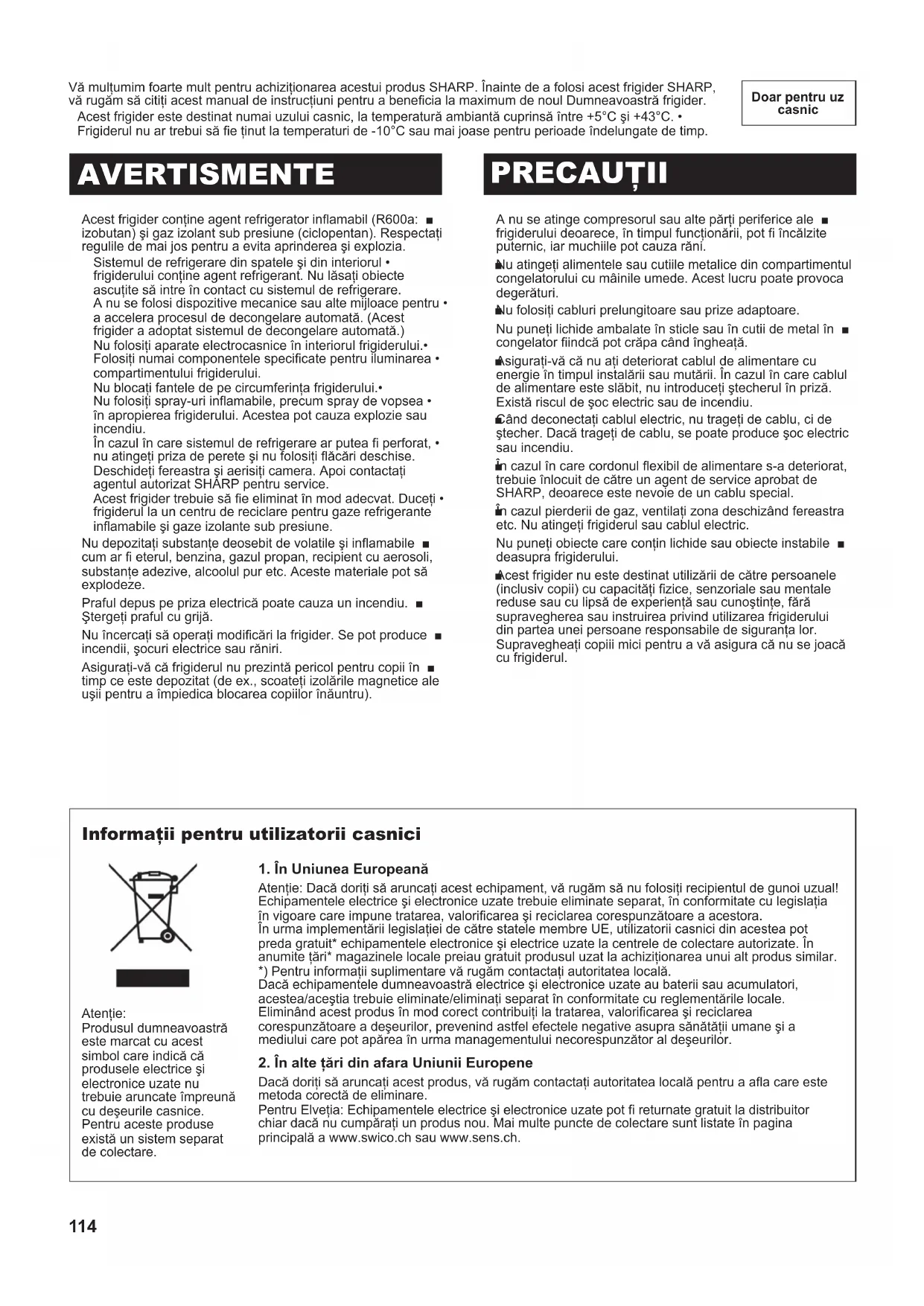 Vă mulţumim foarte mult pentru achiziţionarea acestui produs SHARP. Înainte de a folosi acest frigider SHARP,