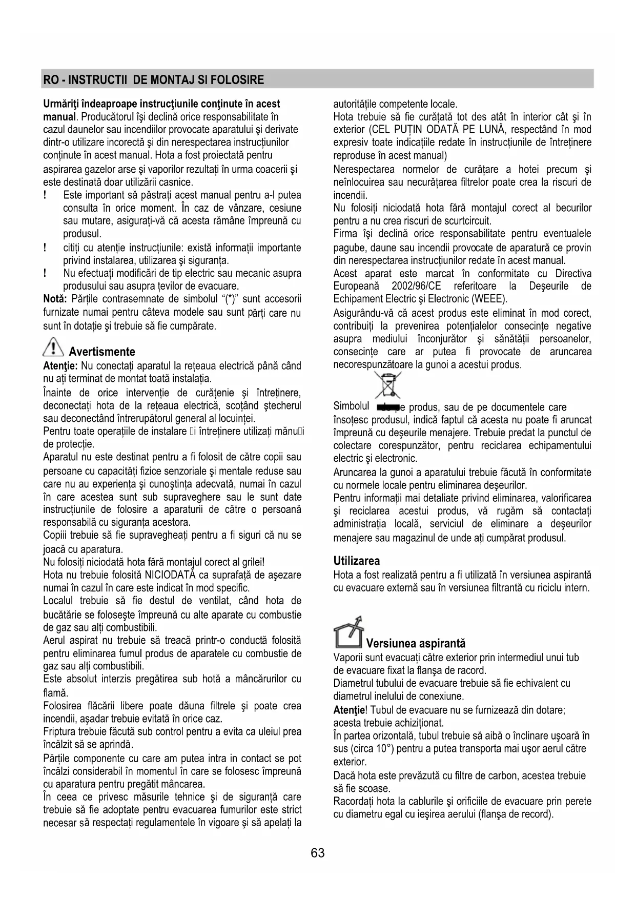 conţinute în acest manual. Hota a fost proiectată pentru