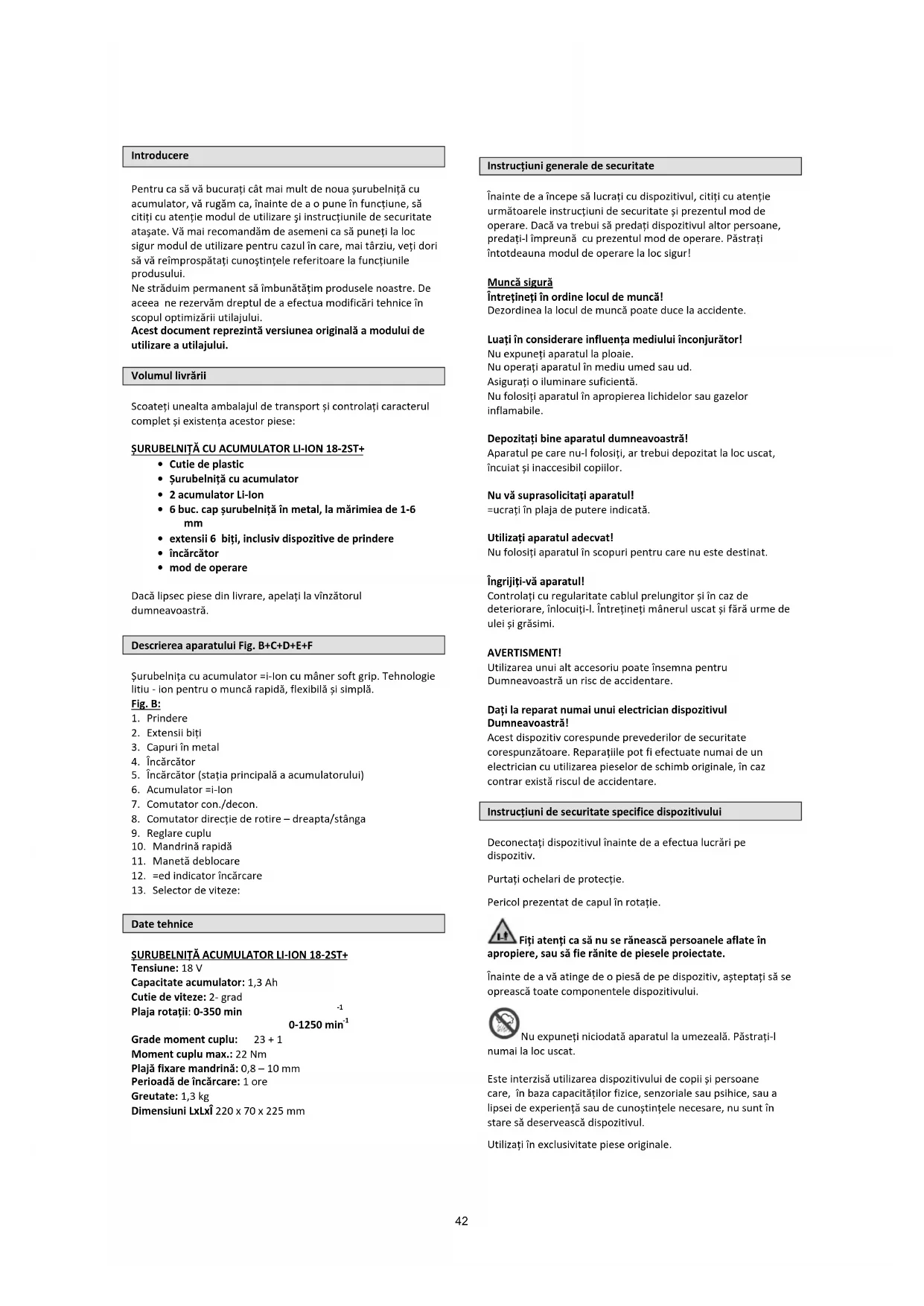 Grade moment cuplu: 23 + 1 Moment cuplu max.: 22 Nm Plajă fixare mandrină: 0,8 – 10 mm Perioadă de încărcare: 1 ore Greutate: 1,3 kg Dimensiuni LxLxÎ 220 x 70 x 225 mm Instrucțiuni generale de securitate Înainte de a începe să lucraţi cu dispozitivul, citiţi cu atenţie următoarele instrucţiuni de securitate și prezentul mod de operare. Dacă va trebui să predaţi dispozitivul altor persoane, predaţi-l împreună cu prezentul mod de operare. Păstraţi întotdeauna modul de operare la loc sigur! Muncă sigură Întrețineți în ordine locul de muncă! Dezordinea la locul de muncă poate duce la accidente. Luați în considerare influența mediului înconjurător! Nu expuneţi aparatul la ploaie. Nu operaţi aparatul în mediu umed sau ud. Asiguraţi o iluminare suficientă. Nu folosiţi aparatul în apropierea lichidelor sau gazelor inflamabile. Depozitați bine aparatul dumneavoastră! Aparatul pe care nu-l folosiţi, ar trebui depozitat la loc uscat, încuiat și inaccesibil copiilor. Nu vă suprasolicitați aparatul! Lucraţi în plaja de putere indicată. Utilizați aparatul adecvat! Nu folosiţi aparatul în scopuri pentru care nu este destinat. Îngrijiți-vă aparatul! Controlaţi cu regularitate cablul prelungitor și în caz de deteriorare, înlocuiţi-l. Întreţineţi mânerul uscat și fără urme de ulei și grăsimi. AVERTISMENT! Utilizarea unui alt accesoriu poate însemna pentru Dumneavoastră un risc de accidentare. Dați la reparat numai unui electrician dispozitivul Dumneavoastră! Acest dispozitiv corespunde prevederilor de securitate corespunzătoare. Reparaţiile pot fi efectuate numai de un electrician cu utilizarea pieselor de schimb originale, în caz contrar există riscul de accidentare. Instrucțiuni de securitate specifice dispozitivului Deconectaţi dispozitivul înainte de a efectua lucrări pe dispozitiv. Purtaţi ochelari de protecţie. Pericol prezentat de capul în rotaţie. Fiți atenți ca să nu se rănească persoanele aflate în apropiere, sau să fie rănite de piesele proiectate. Înainte de a vă atinge de o piesă de pe dispozitiv, așteptaţi să se oprească toate componentele dispozitivului. Nu expuneţi niciodată aparatul la umezeală. Păstraţi-l numai la loc uscat. Este interzisă utilizarea dispozitivului de copii și persoane care, în baza capacităţilor fizice, senzoriale sau psihice, sau a lipsei de experienţă sau de cunoștinţele necesare, nu sunt în stare să deservească dispozitivul. Utilizaţi în exclusivitate piese originale. 42Înainte de punerea în funcţiune, verificaţi dacă bitul șurubelniţei este bine fixat. Nu încercaţi să modificaţi reglarea rotaţiilor motorolui. Dacă aveţi vreo dificultate, apelaţi la un specialist. Înainte de a da găură în perete, verificaţi, în caz de necesitate, cu un dispozitiv de depistare a liniilor electrice, prezenţa curentului electric, a conductelor de apă și de gaze. Utilizare în conformitate cu destinația Indicat pentru înșurubarea și degajarea șuruburilor și pentru găurirea materialelor de lemn, metal și plastic. Orișice altă utilizare este contrarie destinaţiei. Cu acest dispozitiv nu pot fi efectuate alte lucrări decât cele pentru care a fost conceput și construit și care sunt descrise în modul de operare. Producătorul nu garantează daunele ulterioare şi eventualele accidente. Vă rugăm să aveţi în vedere faptul că utilajele noastre nu sunt construite pentru scopuri industriale. Înaintea punerii în funcțiune Acumulatorul se livrează parţial încărcat. Înainte de a fi pus în funcţiune trebuie complet încărcat. ATENȚIE:
