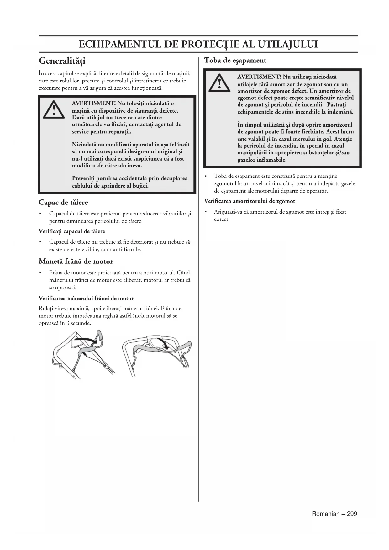 AVERTISMENT! Modificãrile äi/sau accesoriile neaprobate pot duce la rãni grave sau la moartea utilizatorului sau a altor persoane. Orice modificare a construcöiei originale a maäinii este interzisã fãrã aprobarea fabricantului. Niciodatã nu modificaöi aparatul în aäa fel încât sã nu mai corespundã design-ului original äi nu-l utilizaöi dacã existã suspiciunea cã a fost modificat de cãtre altcineva. Nu folosiöi niciodatã o maäinã defectã. Efectuaöi operaöiile regulate de verificare, întreöinere äi service descrise în acest manual. Unele operaöii de întreöinere äi service trebuiesc fãcute de specialiäti cu experienöã äi calificaöi. Folosiöi întotdeauna piese de schimb originale.UTILIZAREA Romanian – 303• Fiöi atent la mediul înconjurãtor pentru a vã asigura cã nu existã factori care ar putea influenöa controlul asupra utilajului.• Feriöi-vã de rãdãcini, pietre, crenguöe, adâncituri, äanöuri etc. În iarba înaltã se pot ascunde obstacole.• Tunderea în pantã poate fi periculoasã. Nu utilizaöi maäina pentru tuns gazonul în pante foarte înclinate. Maäina pentru tuns gazonul nu trebuie utilizatã în pante mai mari de 15 grade.• Pe teren înclinat calea trebuie sã fie perpendicularã pe pantã. Este mai uäor de a se lucra de-a lungul pantei, decât în sus äi în jos.• Procedaöi cu atenöie atunci când vã apropiaöi de colöuri ascunse äi de obiecte care vã pot bloca vederea. Siguranöa în lucru