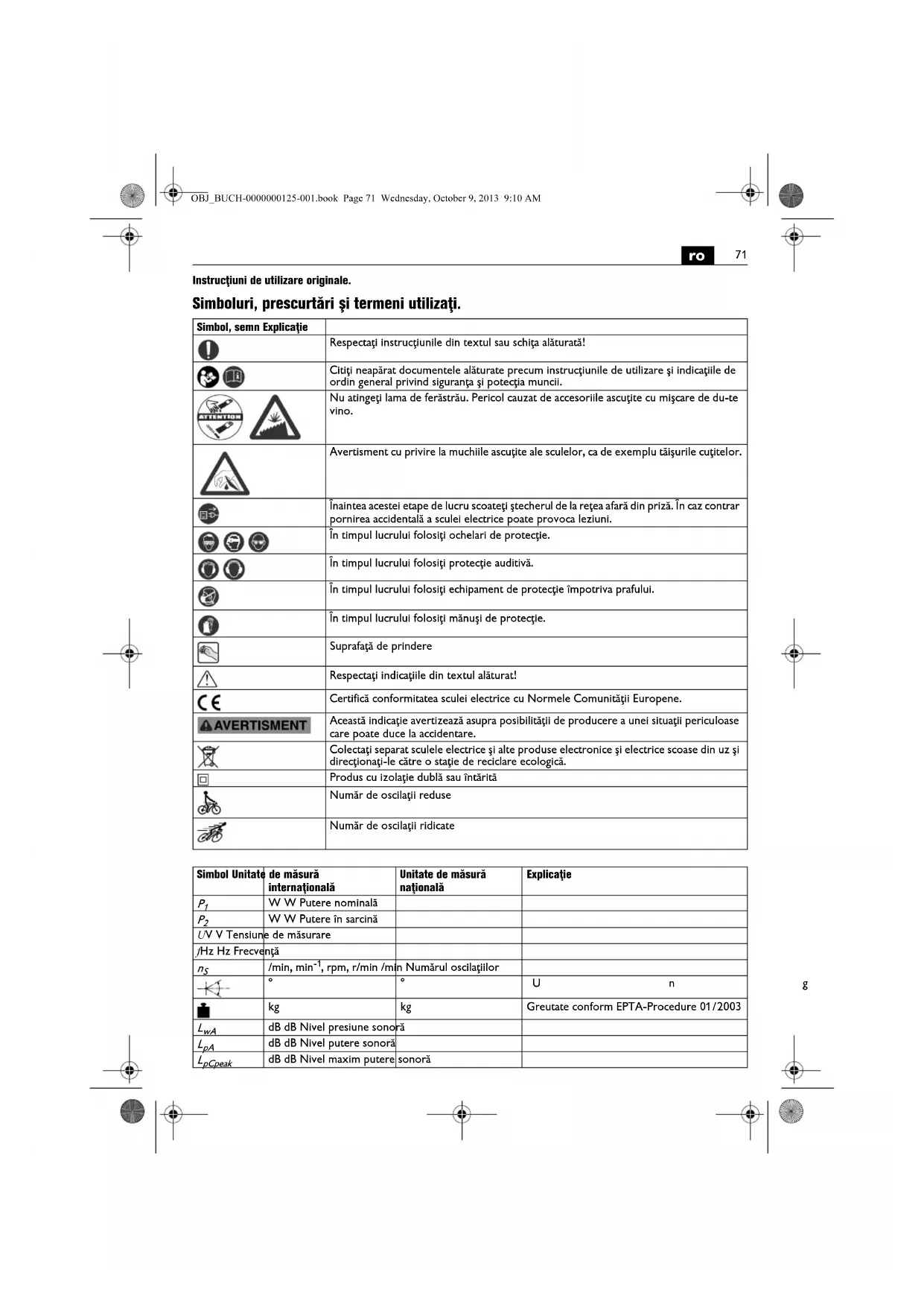 | m, s, kg, A, mm, V, W, Hz, N, °C, dB, min, m/s2 | m, s, kg, A, mm, V, W, Hz, N, °C, dB, min, m/s2 | Unități de măsură de bază sau derivate din Sistemul International SI. |