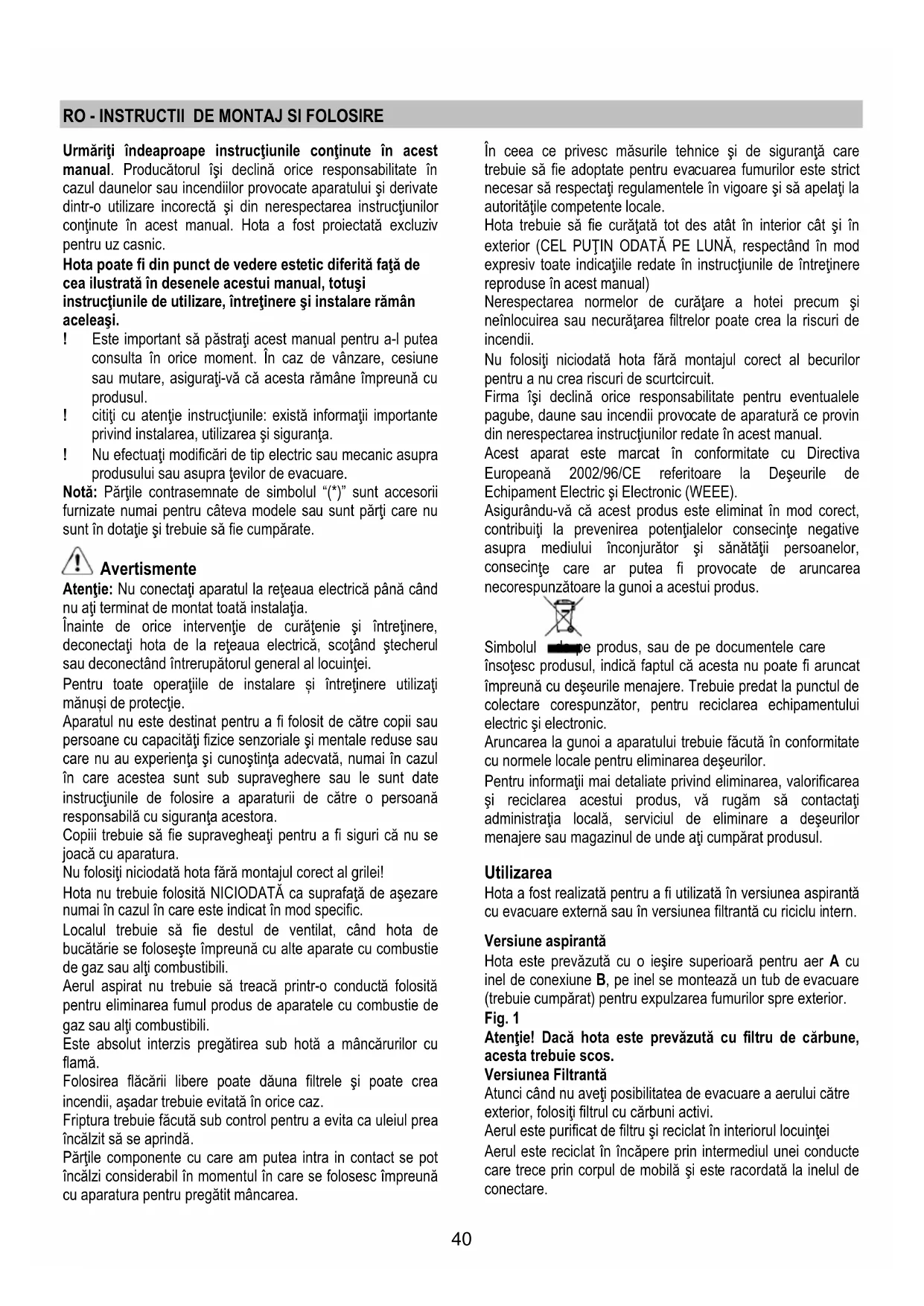 Urmarii indeaprope instruunile continute in acest manual. Producatorul i si declina orice responsabilitate in cazul daunelor sau incendiilor provocate aparatului si derivate dintr-outilizare incorecta si din nerespectarea instructiunilor continute in acest manual.Hota a fost proiectata excluziv pentru uz casnic.