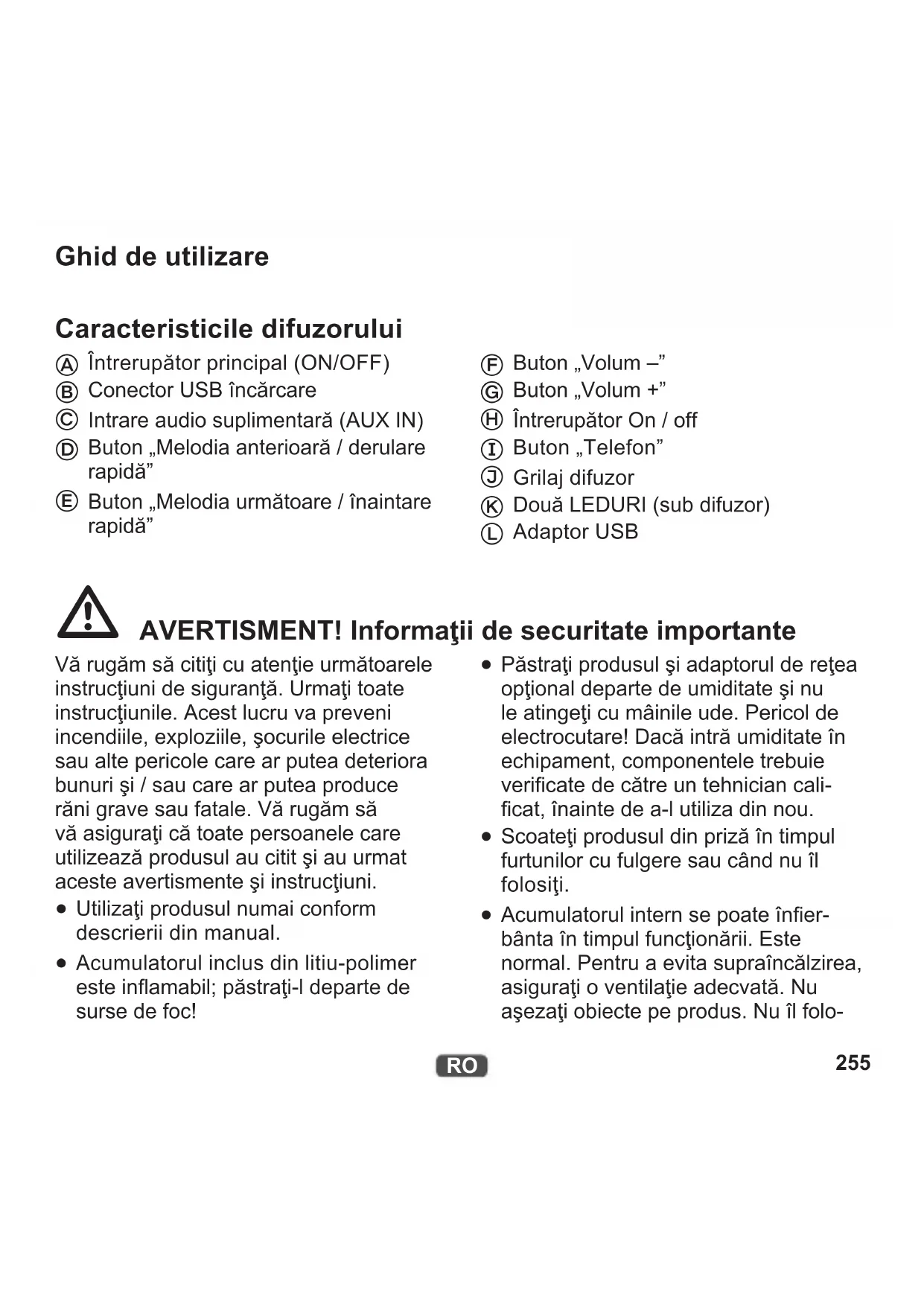 Ghid de utilizare Caracteristicile difuzorului