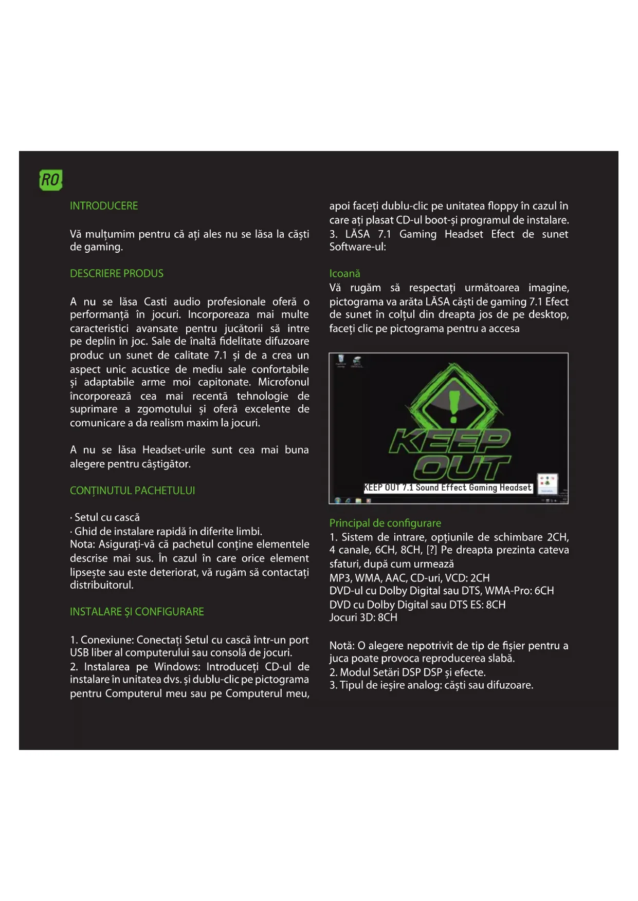 Показва информация за софтуера и ви позволява да показвате или не софтуер иконата на работния плот. KEEPOUT Virtual 7.1 CH Audio Device Ver: 1.0 Copyright © 2013, KEEPOUT URL: www.keep-out.eu ТЕХНИЧЕСКА ПОДДРЪЖКА За повече информация относно инсталирането и конфигурирането на този продукт в нашия сайт www.keepout.eu или напишете имейл на следния адрес: support@keep-out.eu.RO INTRODUCERE Vă mulțumim pentru că ați ales nu se lăsa la căști de gaming. DESCRIERE PRODUS A nu se lăsa Casti audio profesionale oferă o performanță în jocuri. Incorporeaza mai multe caracteristici avansate pentru jucătorii să intre pe deplin în joc. Sale de înaltă delitate difuzoare produc un sunet de calitate 7.1 și de a crea un aspect unic acustice de mediu sale confortabile și adaptabile arme moi capitonate. Microfonul încorporează cea mai recentă tehnologie de suprimare a zgomotului și oferă excelente de comunicare a da realism maxim la jocuri. A nu se lăsa Headset-urile sunt cea mai buna alegere pentru câștigător.