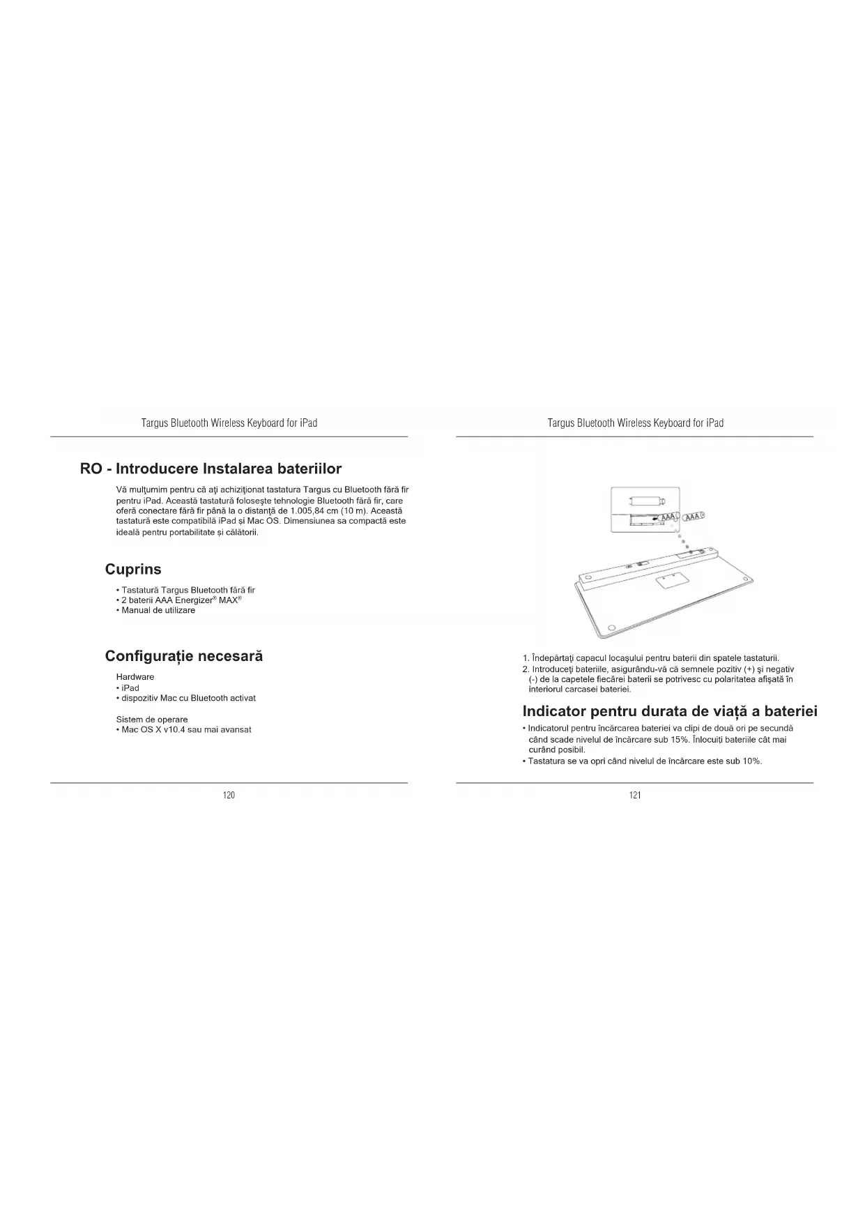 RO - Introducere Instalarea bateriilor Indicator pentru durata de viaţă a bateriei Cuprins Conguraţie necesară Vă mulţumim pentru că aţi achiziţionat tastatura Targus cu Bluetooth fără r pentru iPad. Această tastatură foloseşte tehnologie Bluetooth fără r, care oferă conectare fără r până la o distanţă de 1.005,84 cm (10 m). Această tastatură este compatibilă iPad și Mac OS. Dimensiunea sa compactă este ideală pentru portabilitate și călătorii.