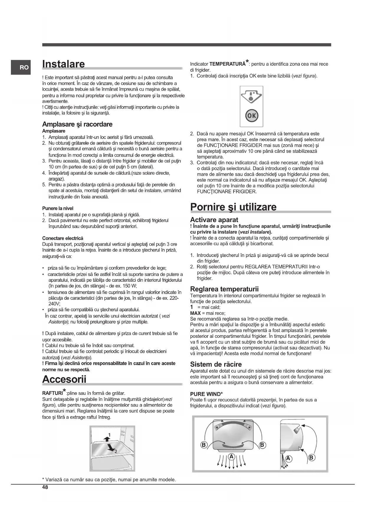 2. Dacă nu apare mesajul OK înseamnă că temperatura este prea mare. În acest caz, este necesar să deplasaţi selectorul de FUNCŢIONARE FRIGIDER mai sus (zonă mai rece) şi să aşteptaţi aproximativ 10 ore până când se stabilizează temperatura.3. Controlaţi din nou indicatorul; dacă este necesar, reglaţi încă o dată poziţia selectorului. Dacă introduceţi o cantitate mai mare de alimente sau dacă deschideţi uşa frigiderului prea des, este normal ca indicatorul să nu aşeze mesajul OK. Aşteptaţi cel puţin 10 ore înainte de a modica poziţia selectorului FUNCŢIONARE FRIGIDER. Pornire şi utilizare Activare aparat ! Înainte de a pune în funcţiune aparatul, urmăriţi instrucţiunile cu privire la instalare (vezi Instalare). ! Înainte de a conecta aparatul la reţea, curăţaţi compartimentele şi accesoriile cu apă călduţă şi bicarbonat.1. Introduceţi ştecherul în priză şi asiguraţi-vă că se aprinde becul din frigider.2. Rotiţi selectorul pentru REGLAREA TEMEPRATURII într-o poziţie de mijloc. După câteva ore puteţi introduce alimentele în frigider. Reglarea temperaturii Temperatura în interiorul compartimentului frigider se reglează în funcţie de poziţia selectorului. 1 = mai cald; MAX = mai rece;Se recomandă reglarea sa într-o poziţie medie.Pentru a mări spaţiul la dispoziţie şi a îmbunătăţi aspectul estetic al acestui produs, partea refrigerentă a fost amplasată în peretele posterior al compartimentului frigider. În timpul funcţionării, peretele va acoperit cu un strat subţire de brumă sau cu picături mici de apă, în funcţie de starea compresorului (activat sau dezactivat). Nu vă impacientaţi! Acesta este modul normal de funcţionare! Sistem de răcire Aparatul este dotat cu unul din sistemele de răcire descrise mai jos: este important să îl recunoaşteţi şi să ţineţi cont de funcţionarea acestuia pentru a asigura o bună conservare a alimentelor.PURE WIND*Poate uşor recuoscut datorită prezenţei, în partea de sus a frigiderului, a dispozitivului indicat (vezi gura).