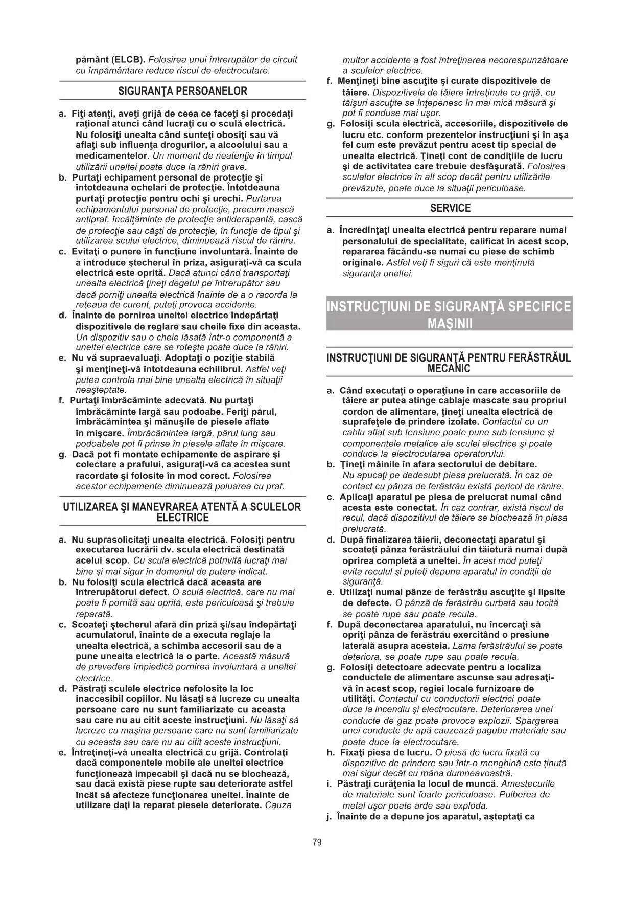 INSTRUCŢIUNI DE SIGURANŢĂ SPECIFICE MAŞINII INSTRUCŢIUNI DE SIGURANŢĂ PENTRU FERĂSTRĂUL MECANIC