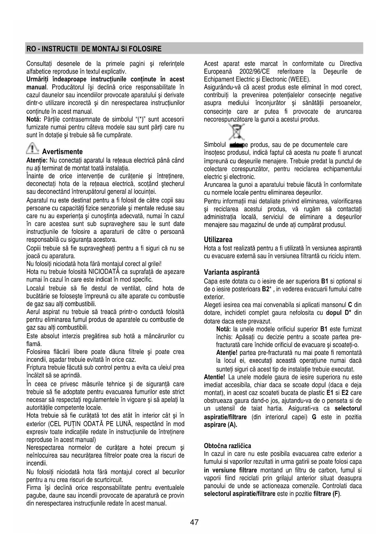 sfătuim să respectaţi îndeaproape instrucţiunile prezente în