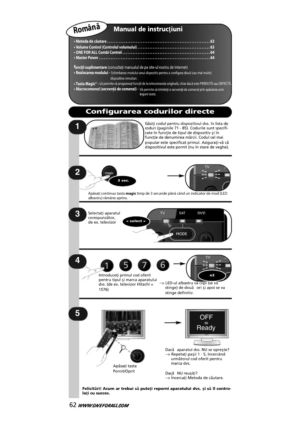 d ispozitivul este pornit (nu în stare de veghe).Apăsaţi continuu tasta magic timp de 3 secunde până când un indicator de mod (LEDalbastru) rămâne aprins.Introduceţi primul cod oferitpentru tipul şi marca aparatuluidvs. (de ex. televizor Hitachi =1576)--> LED-ul albastru va clipi (se va stinge) de două ori şi apoi se va stinge definitiv.Dacă aparatul dvs. NU se opreşte?--> Repetaţi paşii 1 - 5, încercândurmătorul cod oferit pentru marca dvs.Dacă NU reuşiţi?--> Încercaţi Metoda de căutare. Felicitări! Acum ar trebui să puteţi reporni aparatului dvs. şi să îl contro- laţi cu succes.< select >Selectaţi aparatulcorespunzător,de ex. televizor 3 sec. 2