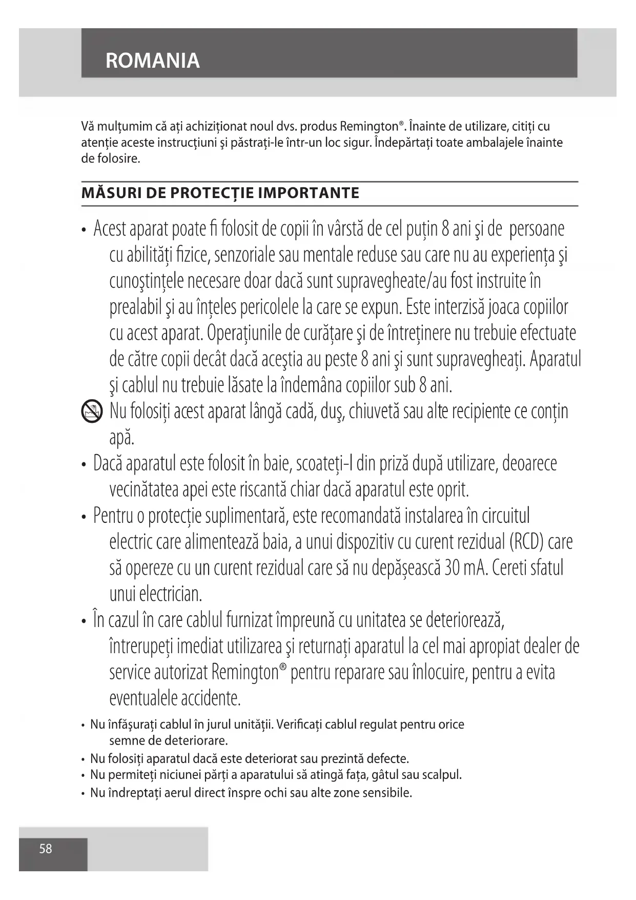 ROMANIA Vă mulţumim că aţi achiziţionat noul dvs. produs Remington®. Înainte de utilizare, citiţi cu