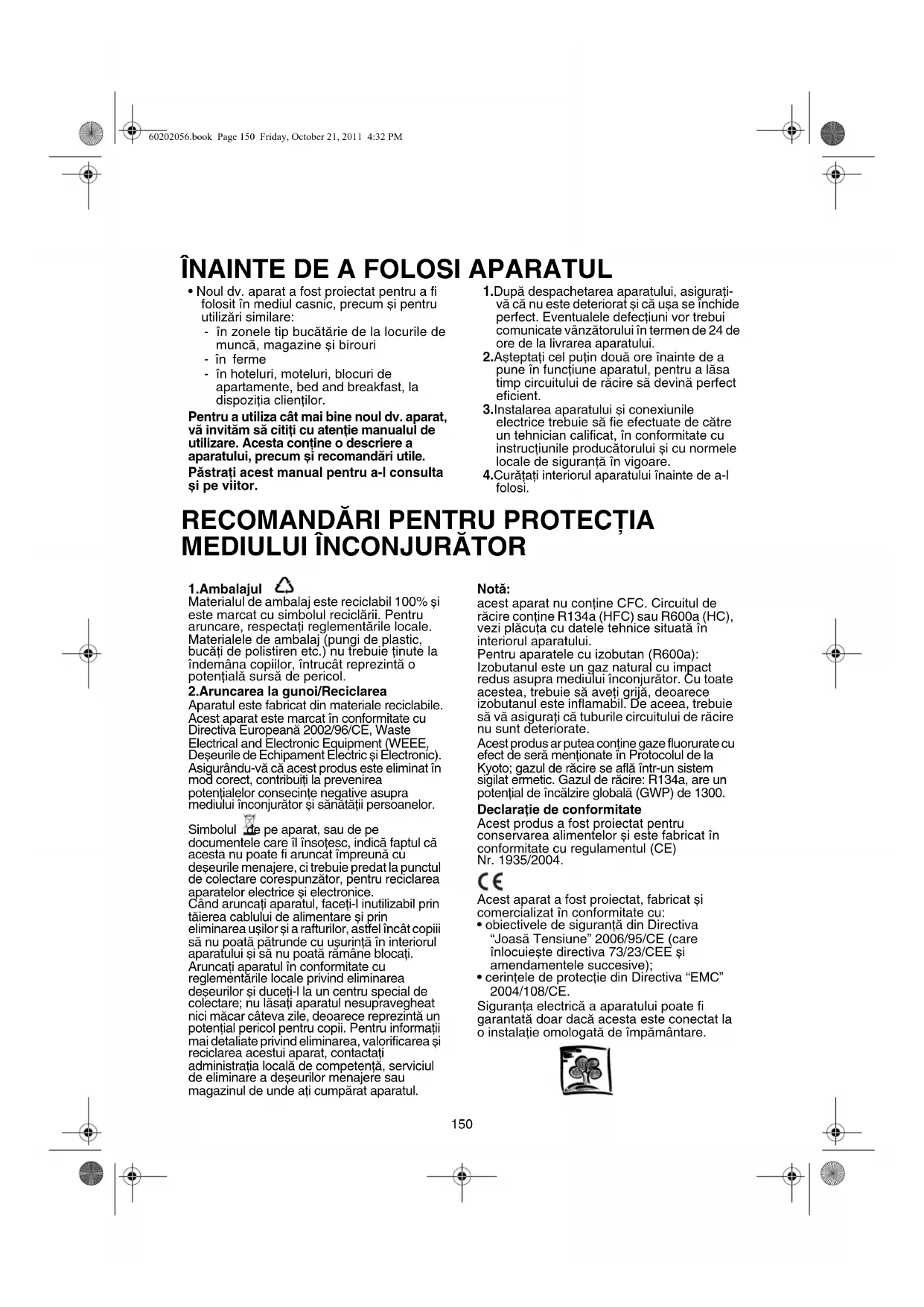 ÎNAINTE DE A FOLOSI APARATUL RECOMANDĂRI PENTRU PROTECŢIA MEDIULUI ÎNCONJURĂTOR