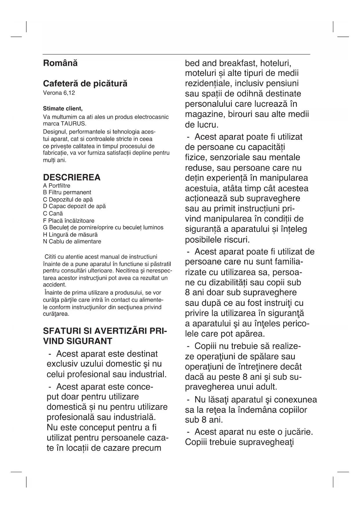 MANUAL DE UTILIZARE Verona 12 TAURUS