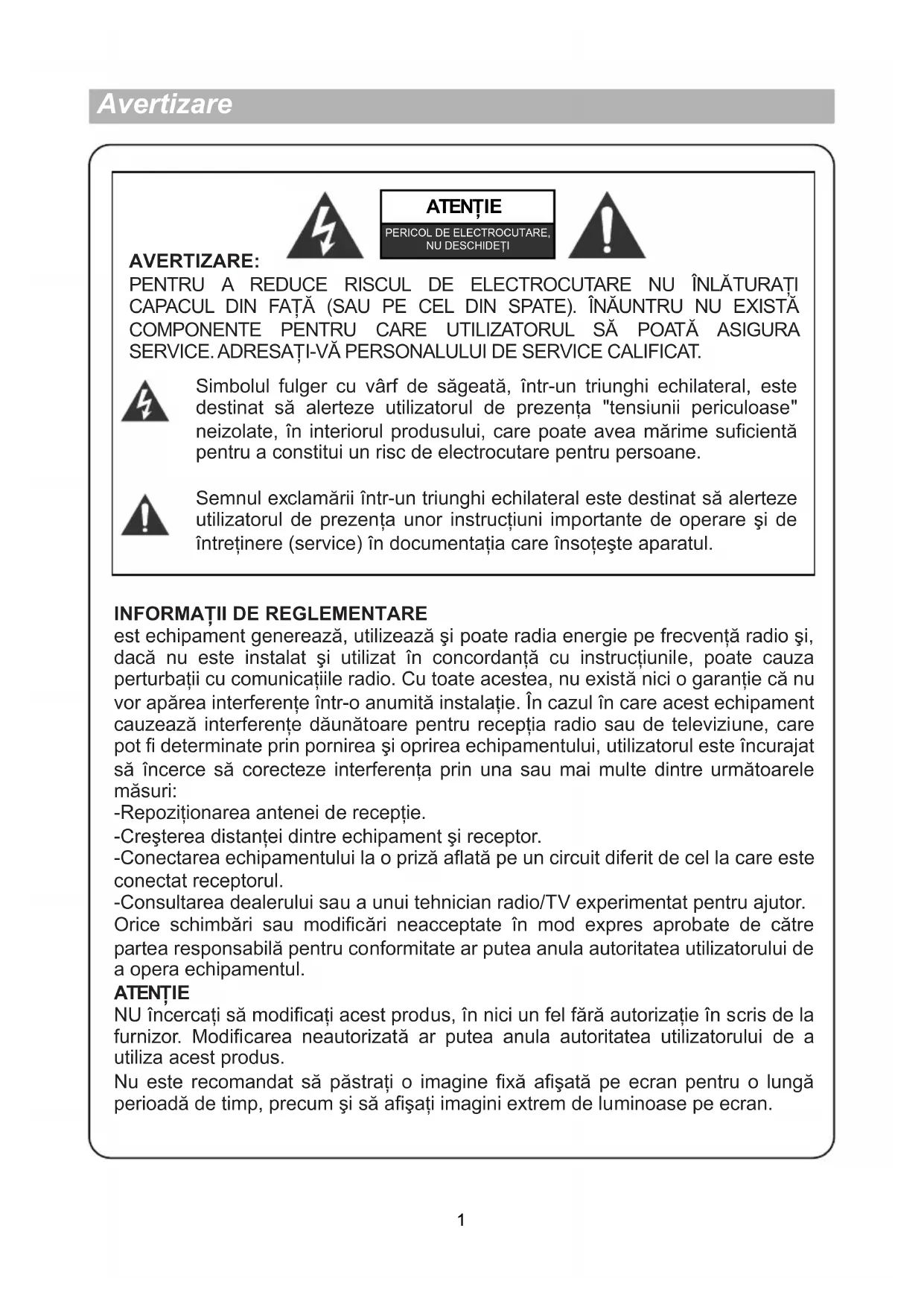 Meniului Canal..................................................................................................... Meniului IMAGINE ............................................................................................... Meniului SUNET.................................................................................................. Meniului TIMP...................................................................................................... Meniului OPTIUNE.............................................................................................. Meniului FIXAT....................................................................................................INFORMAŢII DE REGLEMENTARE est echipament generează, utilizează şi poate radia energie pe frecvenţă radio şi, dacă nu este instalat şi utilizat în concordanţă cu instrucţiunile, poate cauza perturbaţii cu comunicaţiile radio. Cu toate acestea, nu există nici o garanţie că nu vor apărea interferenţe într-o anumită instalaţie. În cazul în care acest echipament cauzează interferenţe dăunătoare pentru recepţia radio sau de televiziune, care pot fi determinate prin pornirea şi oprirea echipamentului, utilizatorul este încurajat să încerce să corecteze interferenţa prin una sau mai multe dintre următoarele măsuri: -Repoziţionarea antenei de recepţie. -Creşterea distanţei dintre echipament şi receptor. -Conectarea echipamentului la o priză aflată pe un circuit diferit de cel la care este conectat receptorul. -Consultarea dealerului sau a unui tehnician radio/TV experimentat pentru ajutor. Orice schimbări sau modificări neacceptate în mod expres aprobate de către partea responsabilă pentru conformitate ar putea anula autoritatea utilizatorului de a opera echipamentul. ATENŢIE NU încercaţi să modificaţi acest produs, în nici un fel fără autorizaţie în scris de la furnizor. Modificarea neautorizată ar putea anula autoritatea utilizatorului de a utiliza acest produs. Nu este recomandat să păstraţi o imagine fixă afişată pe ecran pentru o lungă perioadă de timp, precum şi să afişaţi imagini extrem de luminoase pe ecran.