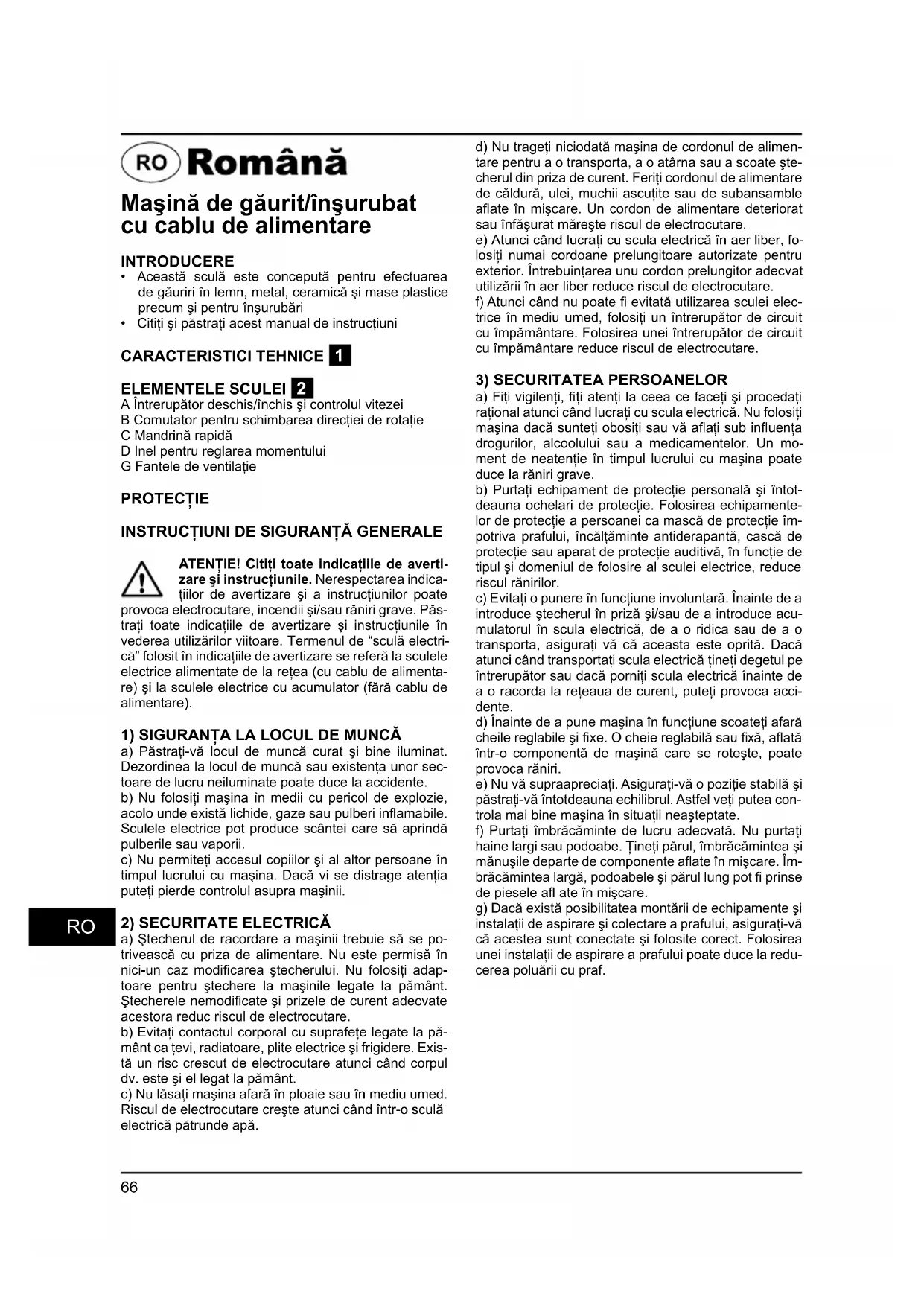 - Citiţi şi păstraţi acest manual de instrucţiuni CARACTERISTICI TEHNICE 1 ELEMENTELE SCULEI 2 A Întrerupător deschis/închis şi controlul vitezei B Comutator pentru schimbarea direcţiei de rotaţie C Mandrină rapidă D Inel pentru reglarea momentului G Fantele de ventilaţie PROTECŢIE