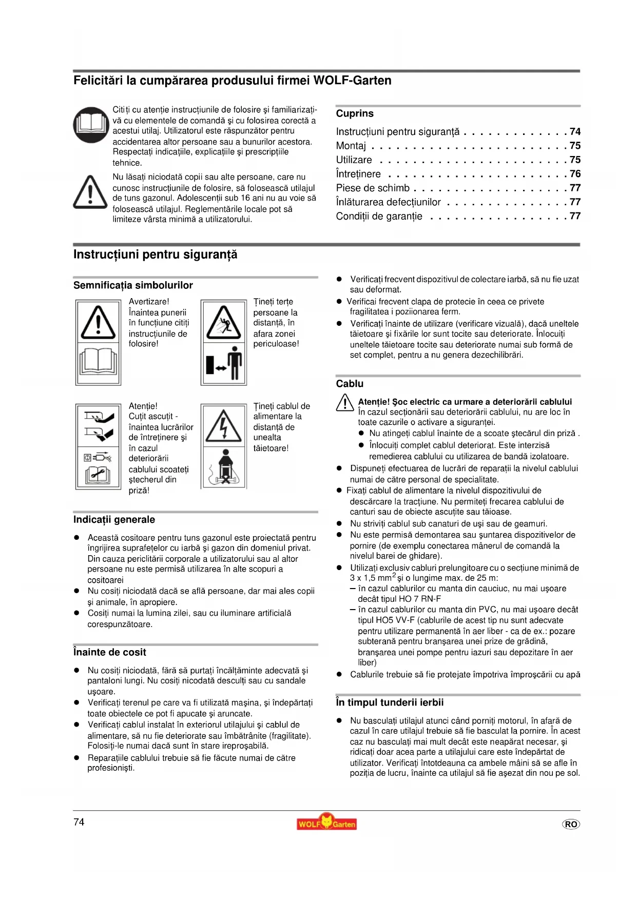 - Felicitări la cumpărarea produsului firmei WOLF-Garten Cuprins InstrucŃiuni pentru siguranŃă p. 74