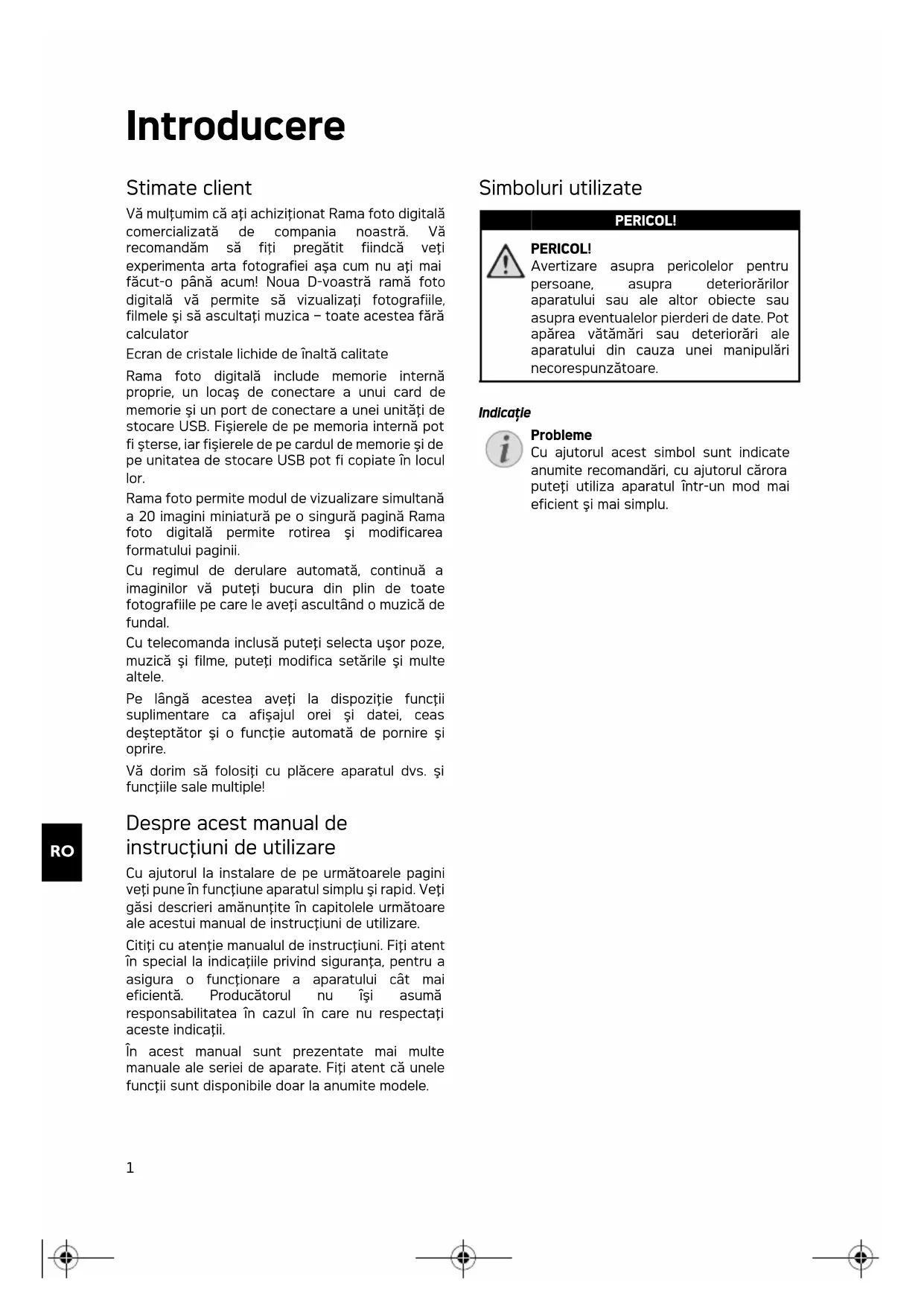 Introducere Stimate client Vă mulţumim că aţi achiziţionat Rama foto digitală comercializată de compania noastră. Vă recomandăm să fiţi pregătit fiindcă veţi experimenta arta fotografiei aşa cum nu aţi mai făcut-o până acum! Noua D-voastră ramă foto digitală vă permite să vizualizaţi fotografiile, filmele şi să ascultaţi muzica – toate acestea fără calculator Ecran de cristale lichide de înaltă calitate Memorie Rama foto digitală include memorie internă proprie, un locaş de conectare a unui card de memorie şi un port de conectare a unei unităţi de stocare USB. Fişierele de pe memoria internă pot fi şterse, iar fişierele de pe cardul de memorie şi de pe unitatea de stocare USB pot fi copiate în locul lor. Rama foto permite modul de vizualizare simultană a 20 imagini miniatură pe o singură pagină Rama foto digitală permite rotirea şi modificarea formatului paginii. Cu regimul de derulare automată, continuă a imaginilor vă puteţi bucura din plin de toate fotografiile pe care le aveţi ascultând o muzică de fundal. Cu telecomanda inclusă puteţi selecta uşor poze, muzică şi filme, puteţi modifica setările şi multe altele. Pe lângă acestea aveţi la dispoziţie funcţii suplimentare ca afişajul orei şi datei, ceas deşteptător şi o funcţie automată de pornire şi oprire. Vă dorim să folosiţi cu plăcere aparatul dvs. şi funcţiile sale multiple! Despre acest manual de instrucţiuni de utilizare Cu ajutorul la instalare de pe următoarele pagini veţi pune în funcţiune aparatul simplu şi rapid. Veţi găsi descrieri amănunţite în capitolele următoare ale acestui manual de instrucţiuni de utilizare. Citiţi cu atenţie manualul de instrucţiuni. Fiţi atent în special la indicaţiile privind siguranţa, pentru a asigura o funcţionare a aparatului cât mai eficientă. Producătorul nu îşi asumă responsabilitatea în cazul în care nu respectaţi aceste indicaţii. În acest manual sunt prezentate mai multe manuale ale seriei de aparate. Fiţi atent că unele funcţii sunt disponibile doar la anumite modele. Simboluri utilizate Avertizare asupra pericolelor Probleme PERICOL! PERICOL! Avertizare asupra pericolelor pentru persoane, asupra deteriorărilor aparatului sau ale altor obiecte sau asupra eventualelor pierderi de date. Pot apărea vătămări sau deteriorări ale aparatului din cauza unei manipulări necorespunzătoare. Indicaţie Probleme Cu ajutorul acest simbol sunt indicate anumite recomandări, cu ajutorul cărora puteţi utiliza aparatul într-un mod mai eficient şi mai simplu. af-5077_5087_5107psms_manual_12_ro_253243477-a.book Seite 1 Donnerstag, 2. Juli 2009 12:00 122