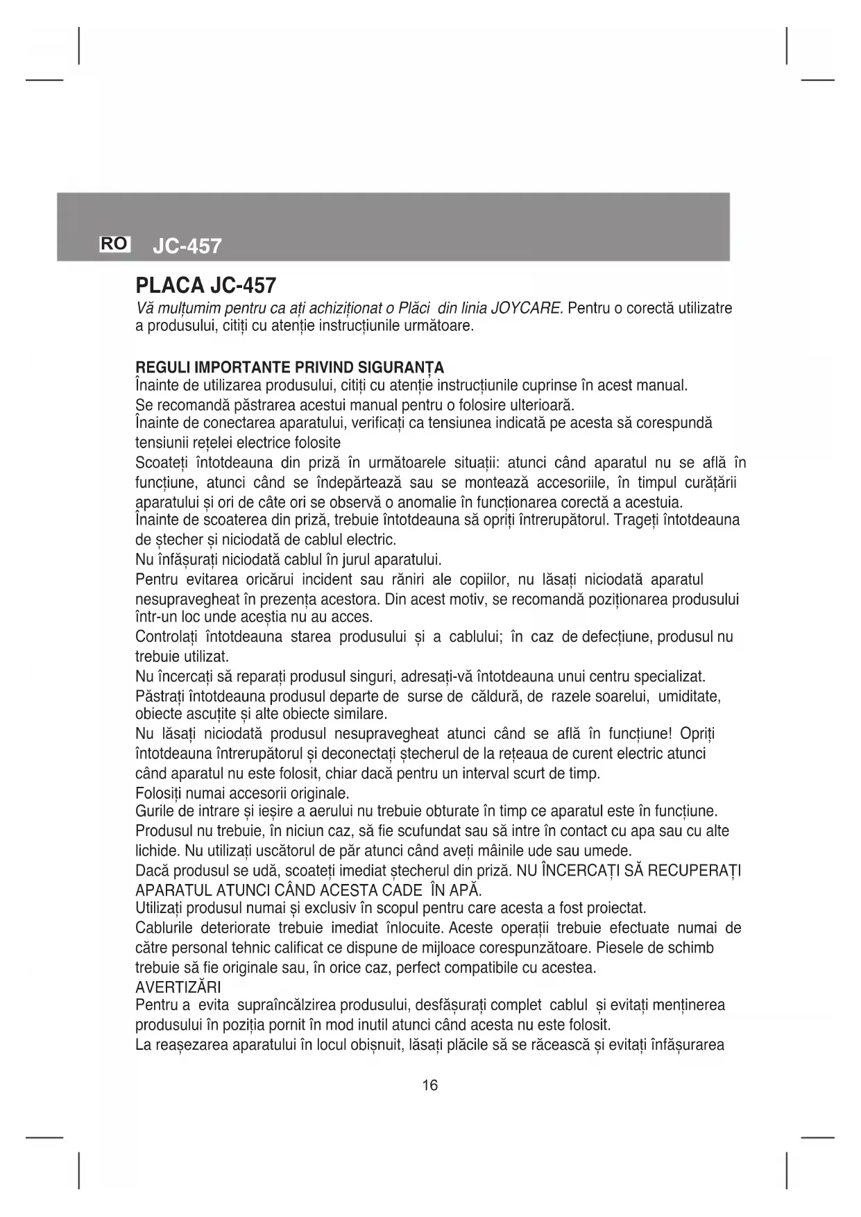 JC-457 PLACA JC-457 Vă mulțumim pentru ca ați achiziționat o Plăci din linia JOYCARE. Pentru o corectă utilizatre a produsului, citiți cu atenție instrucțiunile următoare.