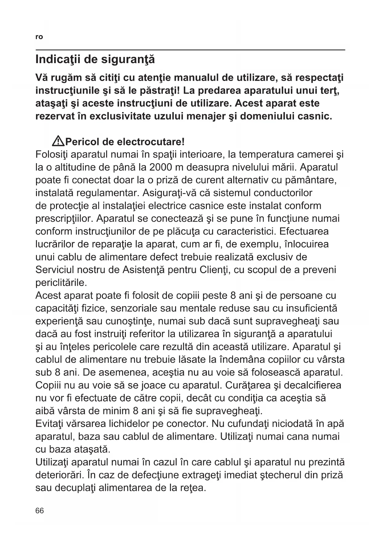 Indicaţii de siguranţă Vă rugăm să citiţi cu atenţie manualul de utilizare, să respectaţi instrucţiunile şi să le păstraţi! La predarea aparatului unui terţ, ataşaţi şi aceste instrucţiuni de utilizare. Acest aparat este rezervat în exclusivitate uzului menajer şi domeniului casnic. WPericol de electrocutare! Folosiţi aparatul numai în spaţii interioare, la temperatura camerei şi la o altitudine de până la 2000 m deasupra nivelului mării. Aparatul poate conectat doar la o priză de curent alternativ cu pământare, instalată regulamentar. Asiguraţi-vă că sistemul conductorilor de protecţie al instalaţiei electrice casnice este instalat conform prescripţiilor. Aparatul se conectează şi se pune în funcţiune numai conform instrucţiunilor de pe plăcuţa cu caracteristici. Efectuarea lucrărilor de reparaţie la aparat, cum ar , de exemplu, înlocuirea unui cablu de alimentare defect trebuie realizată exclusiv de Serviciul nostru de Asistenţă pentru Clienţi, cu scopul de a preveni periclitările. Acest aparat poate folosit de copiii peste 8 ani şi de persoane cu capacităţi zice, senzoriale sau mentale reduse sau cu insucientă experienţă sau cunoştinţe, numai sub dacă sunt supravegheaţi sau dacă au fost instruiţi referitor la utilizarea în siguranţă a aparatului şi au înţeles pericolele care rezultă din această utilizare. Aparatul şi cablul de alimentare nu trebuie lăsate la îndemâna copiilor cu vârsta sub 8 ani. De asemenea, aceştia nu au voie să folosească aparatul. Copiii nu au voie să se joace cu aparatul. Curăţarea şi decalcierea nu vor efectuate de către copii, decât cu condiţia ca aceştia să aibă vârsta de minim 8 ani şi să e supravegheaţi. Evitaţi vărsarea lichidelor pe conector. Nu cufundaţi niciodată în apă aparatul, baza sau cablul de alimentare. Utilizaţi numai cana numai cu baza ataşată. Utilizaţi aparatul numai în cazul în care cablul şi aparatul nu prezintă deteriorări. În caz de defecţiune extrageţi imediat ştecherul din priză sau decuplaţi alimentarea de la reţea.67
