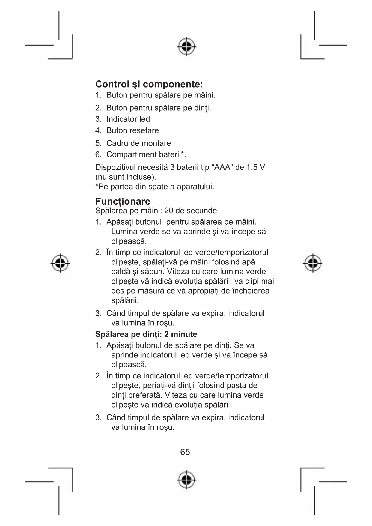 Dispozitivul necesită 3 baterii tip “AAA” de 1,5 V (nu sunt incluse). *Pe partea din spate a aparatului. Funcţionare Spălarea pe mâini: 20 de secunde