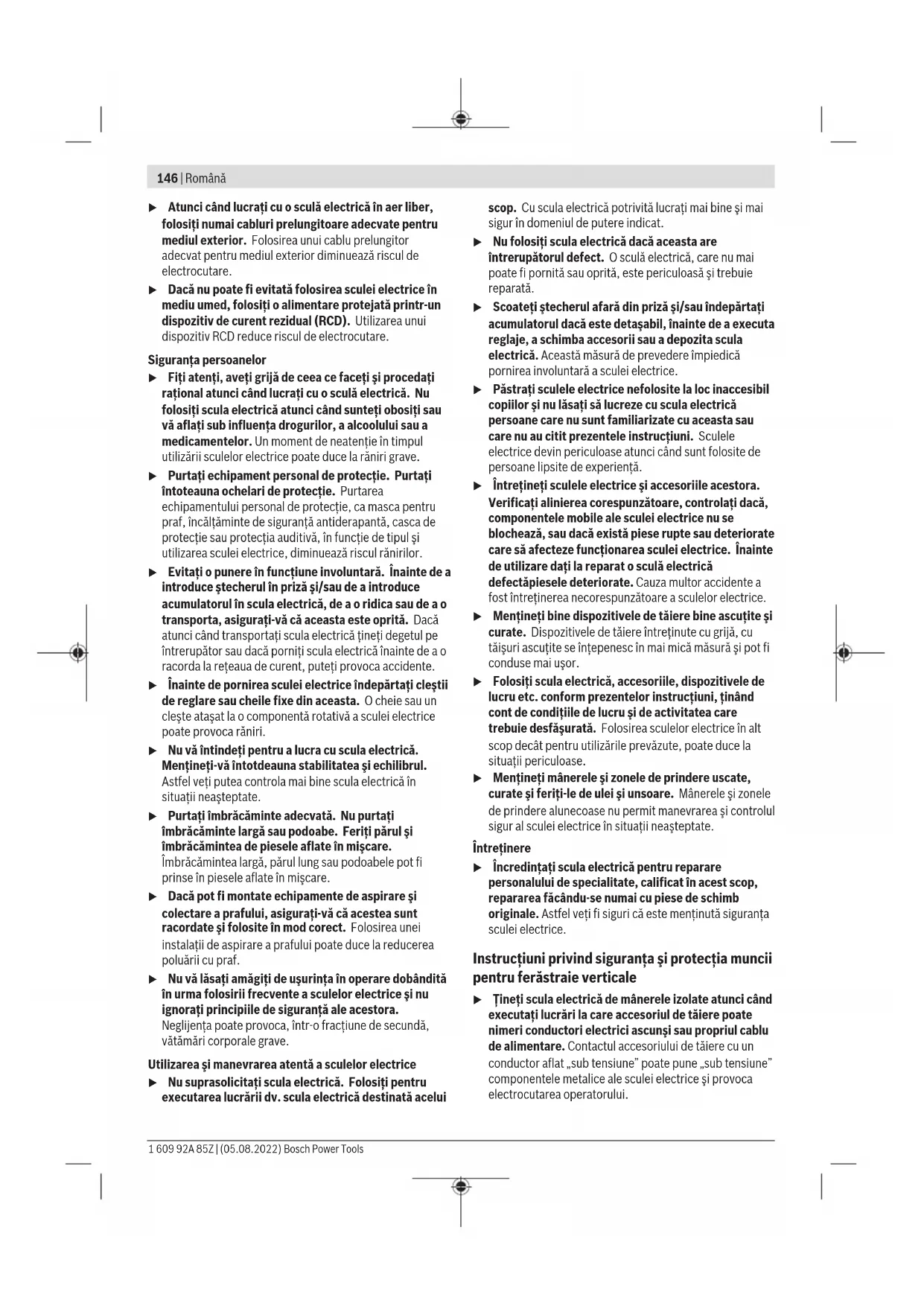 sau încurcate măresc riscul de electrocutare. Bosch Power Tools 1 609 92A 85Z | (05.08.2022)146 | Română