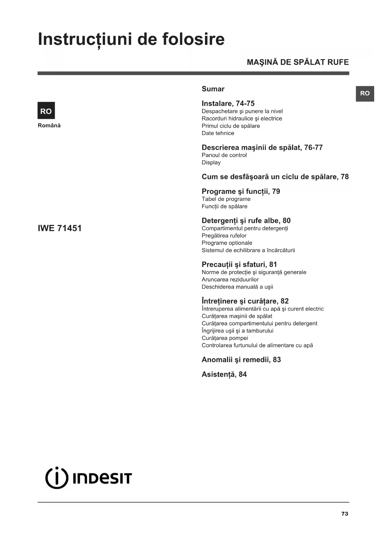 Română Sumar Instalare, 74-75 Despachetare şi punere la nivelRacorduri hidraulice şi electricePrimul ciclu de spălareDate tehnice Descrierea maşinii de spălat, 76-77 Panoul de controlDisplay Cum se desfăşoară un ciclu de spălare, 78 Programe şi funcţii, 79 Tabel de programeFuncţii de spălare Detergenţi şi rufe albe, 80 Compartimentul pentru detergenţiPregătirea rufelorPrograme optionaleSistemul de echilibrare a încărcăturii Precauţii şi sfaturi, 81 Norme de protecţie şi siguranţă generaleAruncarea reziduurilorDeschiderea manuală a uşii Întreţinere şi curăţare, 82 Întreruperea alimentării cu apă şi curent electricCurăţarea maşinii de spălatCurăţarea compartimentului pentru detergentÎngrijirea uşii şi a tamburuluiCurăţarea pompeiControlarea furtunului de alimentare cu apă Anomalii şi remedii, 83 Asistenţă, 84