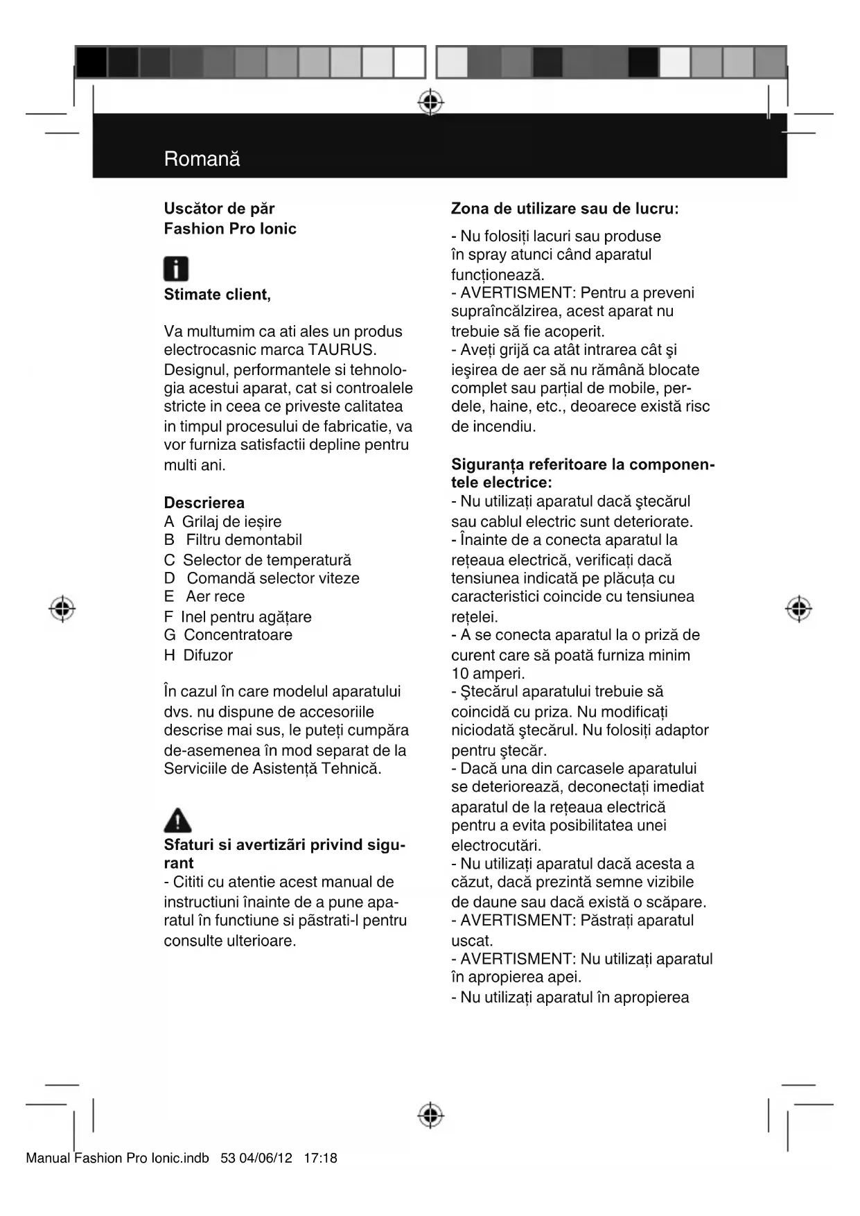 MANUAL DE UTILIZARE Fashion PRO Ionic TAURUS