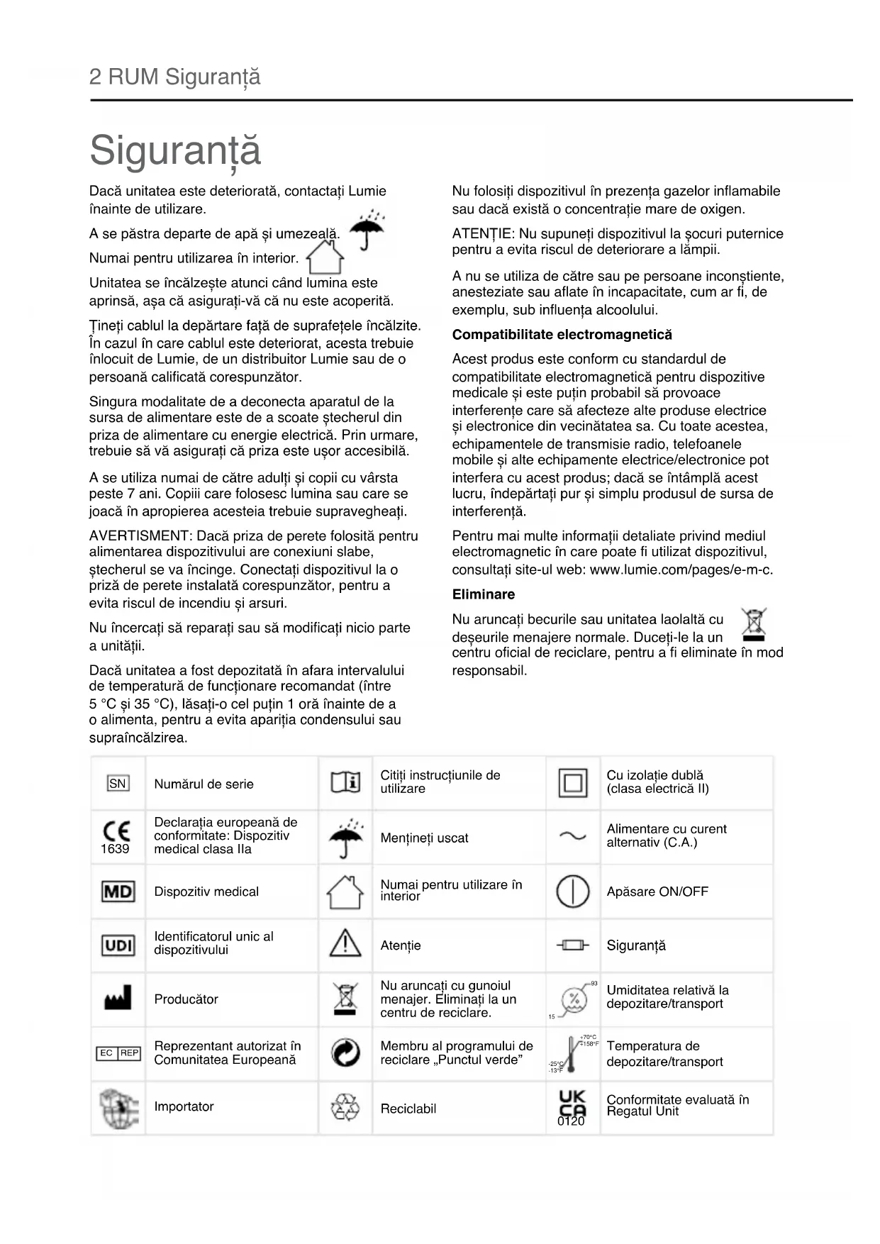 Declarația europeană de conformitate: Dispozitiv medical clasa IIa Nu aruncați cu gunoiul menajer. Eliminați la un centru de reciclare. Cu izolație dublă (clasa electrică II) Umiditatea relativă la depozitare/transport Membru al programului de reciclare „Punctul verde” Apăsare ON/OFF Siguranță Alimentare cu curent alternativ (C.A.) Dacă unitatea este deteriorată, contactați Lumie înainte de utilizare. A se păstra departe de apă și umezeală. Numai pentru utilizarea în interior. Unitatea se încălzește atunci când lumina este aprinsă, așa că asigurați-vă că nu este acoperită. Țineți cablul la depărtare față de suprafețele încălzite. În cazul în care cablul este deteriorat, acesta trebuie înlocuit de Lumie, de un distribuitor Lumie sau de o persoană calificată corespunzător. Singura modalitate de a deconecta aparatul de la sursa de alimentare este de a scoate ștecherul din priza de alimentare cu energie electrică. Prin urmare, trebuie să vă asigurați că priza este ușor accesibilă. A se utiliza numai de către adulți și copii cu vârsta peste 7 ani. Copiii care folosesc lumina sau care se joacă în apropierea acesteia trebuie supravegheați. AVERTISMENT: Dacă priza de perete folosită pentru alimentarea dispozitivului are conexiuni slabe, ștecherul se va încinge. Conectați dispozitivul la o priză de perete instalată corespunzător, pentru a evita riscul de incendiu și arsuri. Nu încercați să reparați sau să modificați nicio parte a unității. Dacă unitatea a fost depozitată în afara intervalului de temperatură de funcționare recomandat (între 5 °C și 35 °C), lăsați-o cel puțin 1 oră înainte de a o alimenta, pentru a evita apariția condensului sau supraîncălzirea. Nu folosiți dispozitivul în prezența gazelor inflamabile sau dacă există o concentrație mare de oxigen. ATENȚIE: Nu supuneți dispozitivul la șocuri puternice pentru a evita riscul de deteriorare a lămpii. A nu se utiliza de către sau pe persoane inconștiente, anesteziate sau aflate în incapacitate, cum ar fi, de exemplu, sub influența alcoolului. Compatibilitate electromagnetică Acest produs este conform cu standardul de compatibilitate electromagnetică pentru dispozitive medicale și este puțin probabil să provoace interferențe care să afecteze alte produse electrice și electronice din vecinătatea sa. Cu toate acestea, echipamentele de transmisie radio, telefoanele mobile și alte echipamente electrice/electronice pot interfera cu acest produs; dacă se întâmplă acest lucru, îndepărtați pur și simplu produsul de sursa de interferență. Pentru mai multe informații detaliate privind mediul electromagnetic în care poate fi utilizat dispozitivul, consultați site-ul web: www.lumie.com/pages/e-m-c. Eliminare Nu aruncați becurile sau unitatea laolaltă cu deșeurile menajere normale. Duceți-le la un centru oficial de reciclare, pentru a fi eliminate în mod responsabil.RUM 3 Precauții Cercetările arată că terapia cu lumină este foarte sigură. Cu toate acestea, vă rugăm să vă adresați mai întâi medicului dumneavoastră dacă se aplică oricare dintre următoarele: Aveți o problemă oculară majoră sau ați suferit o intervenție chirurgicală la ochi; Ați fost sfătuit/ă să evitați lumina puternică sau luați medicamente care pot cauza fotosensibilitate; Ați fost diagnosticat/ă cu depresie sau alte tulburări de dispoziție/somn. Acest lucru este deosebit de important dacă luați și medicamente pentru acest lucru, deoarece terapia cu lumină vă poate afecta și starea de spirit. Câteva persoane prezintă efecte secundare, dar acestea sunt în general ușoare (inclusiv dureri de cap, oboseală oculară, greață și hiperactivitate) și pot fi rezolvate, de obicei, prin simpla stingere a luminii. În următoarele câteva zile, creșteți treptat timpul pe care îl petreceți în fața apratului, pentru a găsi o oră de tratament care să vă convină cel mai bine. Unele persoane întâmpină dificultăți în a dormi și, adesea, acest lucru se datorează utilizării luminii la o oră prea apropiată de ora de somn. Dacă întâmpinați probleme în timpul utilizării Brazil sau dacă ați folosit lumina timp de o săptămână dar nu ați observat niciun beneficiu, vă rugăm să contactați Lumie sau să luați legătura cu medicul dumneavoastră. IMPORTANT: indicațiile din acest prospect nu reprezintă indicații medicale pentru tratarea vreunei afecțiuni. Dacă doctorul dumneavoastră v-a sugerat să folosiți terapia cu lumină, urmați instrucțiunile acestuia și discutați cu el despre orice efecte.
