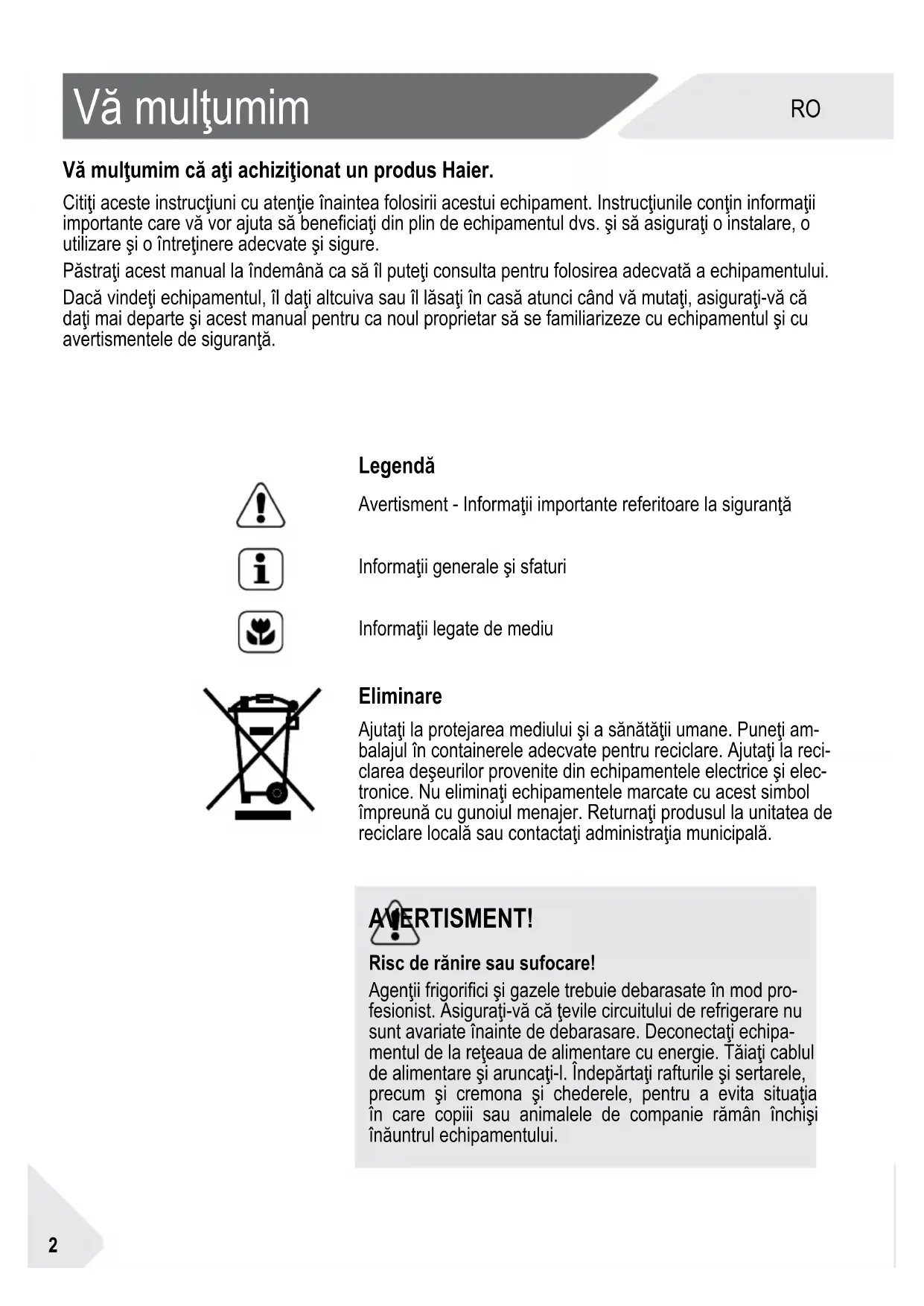 Vă mulţumim că aţi achiziţionat un produs Haier.