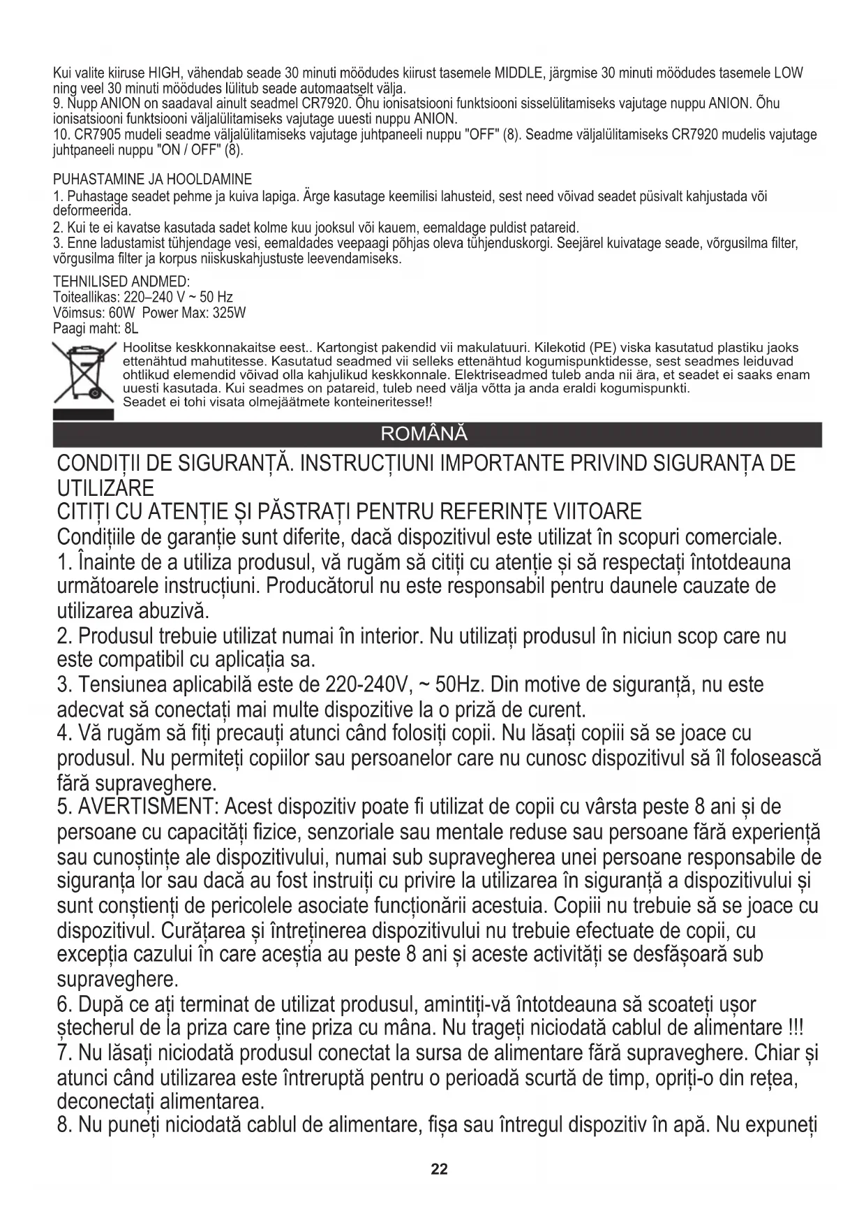 DATE TEHNICE: Capacitate rezervor: 8L Din grija pentru mediul înconjurător. Ambalajele din carton vă rugăm să le transmiteţi şa centrele de maculatură. Sacii din polietilenă (PE) trebuie aruncate în recipientele pentru materialele plastice. Dispozitivul uzat trebuie transmis la punctul corespunzător de depozitare, deoarece componentele periculoase care se găsesc în dispozitiv pot fi foarte periculoase pentru mediul înconjurător. Dispozitivul electric trebuie transmis în aşa fel încât să se limiteze utilizarea lui repetată. Dacă în dispozitiv se găsesc baterii acestea trebuiesc scoase şi transmise către punctul de depozitare a acestora, separat. BOSANSKI SIGURNOSNI USLOVI. VAŽNA UPUTSTVA O SIGURNOSTI KORIŠĆENJA PAŽLJIVO PROČITAJTE I ČUVAJTE ZA BUDUĆU REFERENCU Garancijski uvjeti su različiti ako se uređaj koristi u komercijalne svrhe.