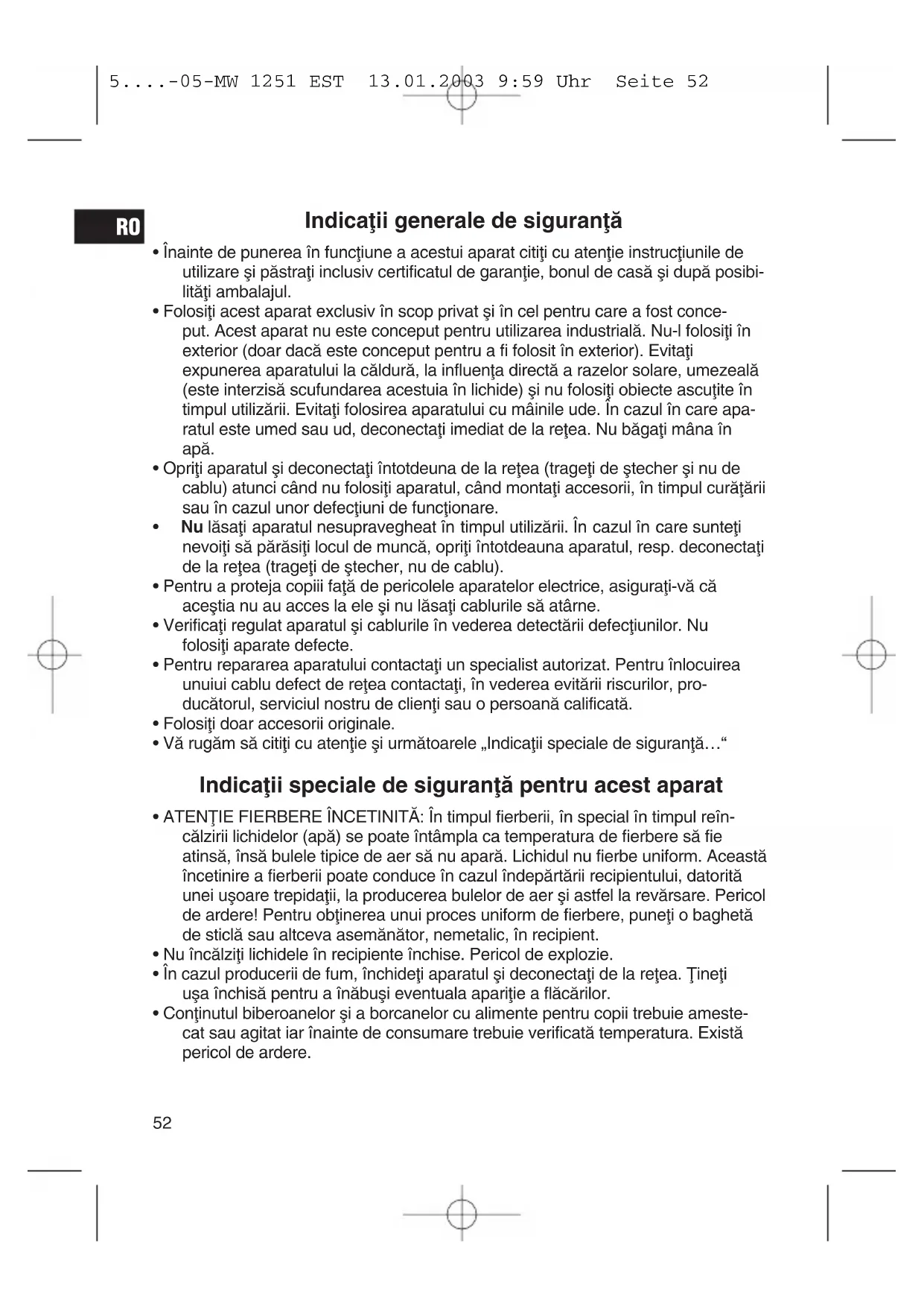 - Nu încælzifli mâncare închisæ precum ouæ, cârnafli, borcane etc. Pericol de explozie!