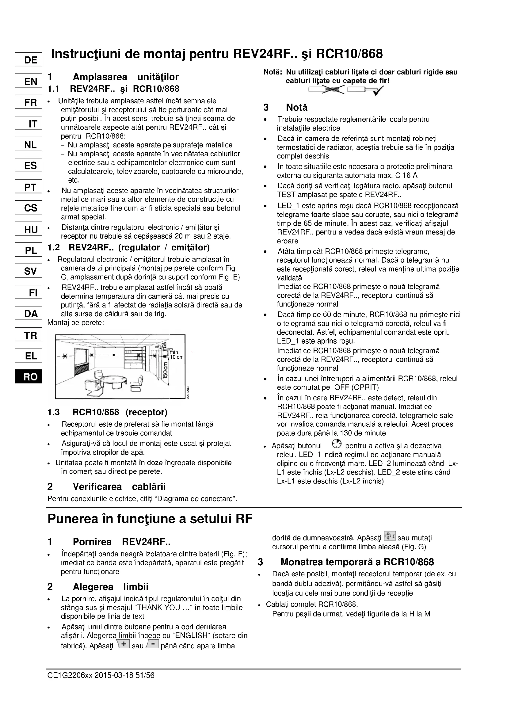 ROCE1G2206xx 2015-03-18 51/56 Instrucţiuni de montaj pentru REV24RF.. şi RCR10/868 1 Amplasarea unităţilor