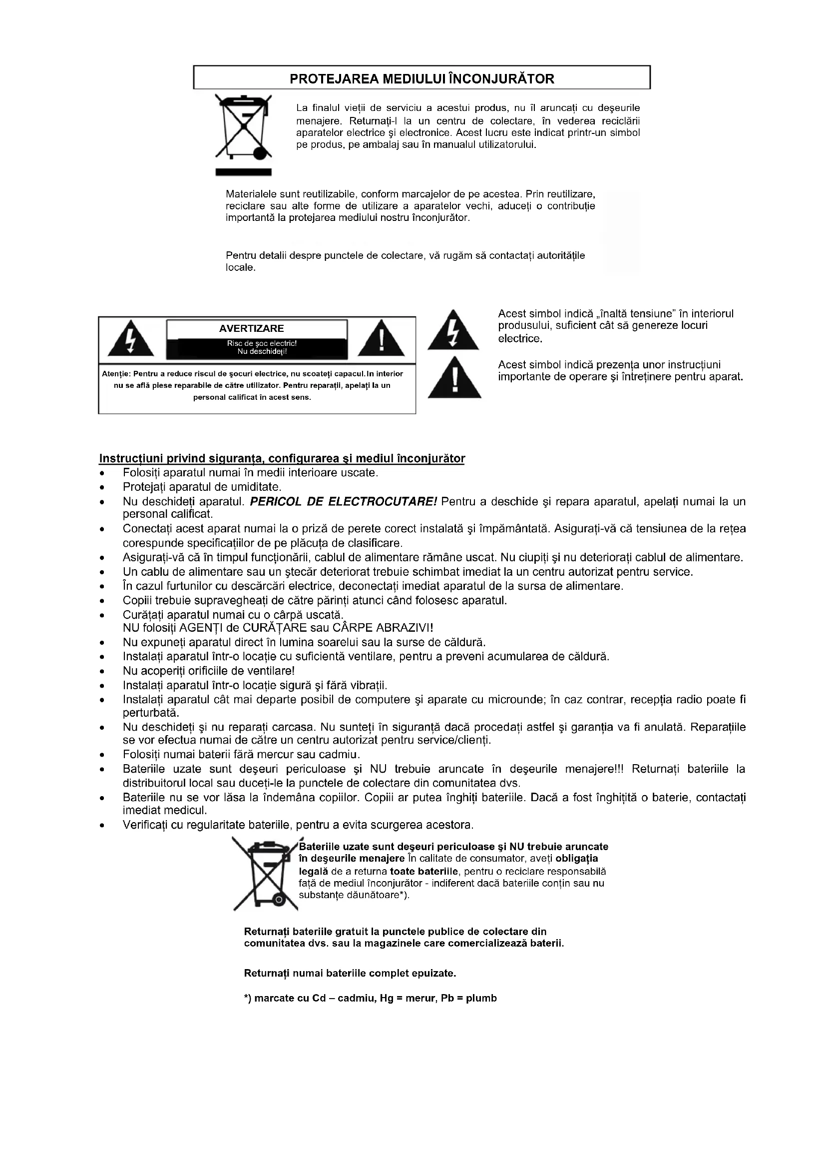 Protejati aparatul de umiditate. - Nu deschideti aparatul. PERICOL DE ELECTROCUTARE! Pouru a descide si repara aparatul, apelati numai la un personal calificat.
