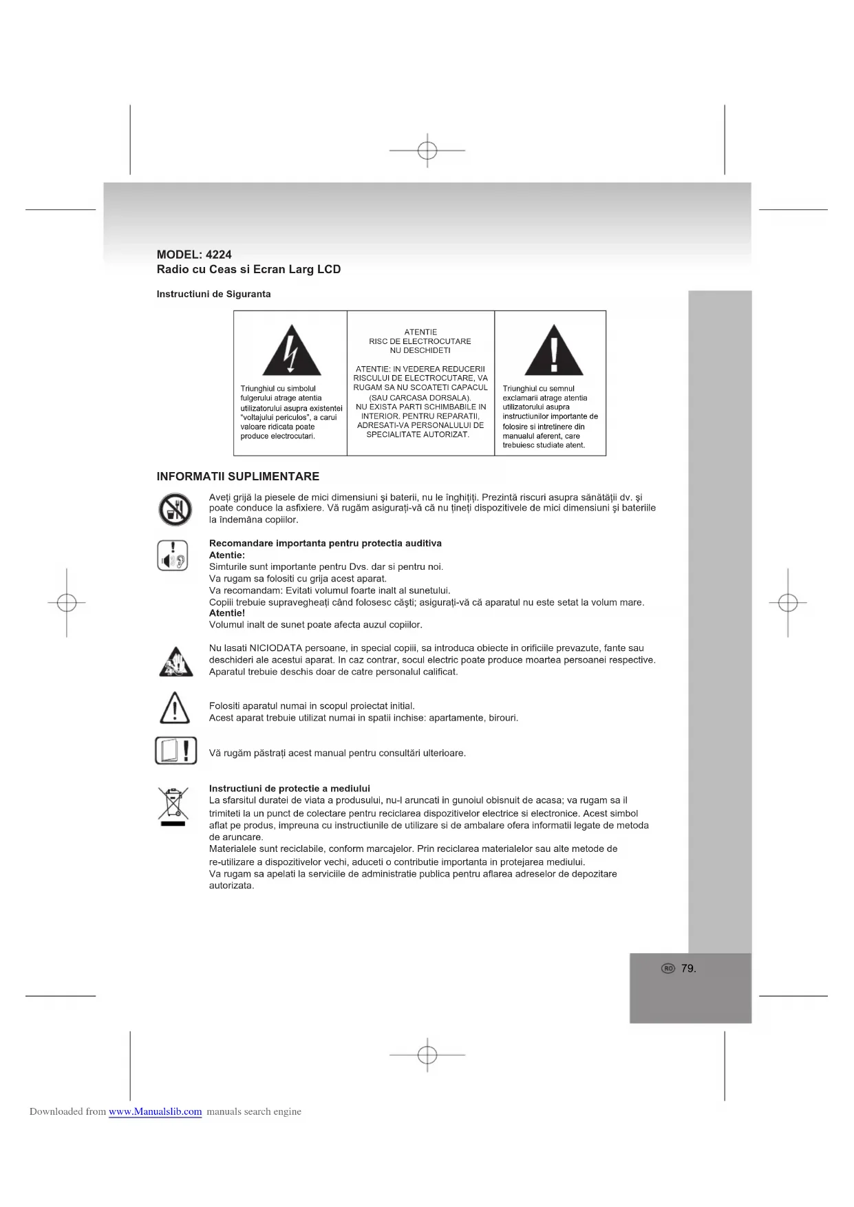 Bir hata oluştuğunda, cihazı herhangi bir tamir işlemine tabi tutmadan evvel aşağıdaki hususları kontrol ediniz.Sorun talimatlara rağmen devam ediyorsa, satıcı veya yetkili servisinize başvurunuz.UYARI: cihazı asla açmayınız. Daima uzman servis veya elemanlardan yardım alınız.Sorun Sebep ÇözümSes Yok Ses düşük seviyeye ayarlanmıştır. Ceryan kablosu bağlı değildir.Sesi ayarlayınız.Ceryan kablosunu bir duvar pirizine takınız.Zayıf Sinyal. Sinyal zayıf.Diğer elektrikli aletler (TV, VCR, Bilgisayar, vs.) parazit yapıyodur.Anteni ayarlayınız.Diğer elektrikli aletler arasında mesafe bırakınız.Tuşlar Çalışmıyor. Tuşlar kısa devre oluyordur. Cihazı kapatıp tekrar çalıştırınız. Ya da, cihazı kapatınız, AC kablosunu ve yedek pili çıkarınız sonra yeniden bağlayınız. Teknik Özellikler Ana güç kaynağı: AC 230V~50HzSaat ve ayrla için yedek pil: DC 3V Lityum düğme pil (CR2032)Frekans aralığı: FM 87.5MHz – 108MHz AM 525kHz – 1615kHzBoyutlar: approx. 60 x 190 x 90 mmAğırlık: yaklaşık 600 g (pil olmadan)Önceden haber verileksizin özellikler değiştirilebilir. Downloaded from www.Manualslib.com manuals search engine79. MODEL: 4224 Radio cu Ceas si Ecran Larg LCD Instructiuni de SigurantaTriunghiul cu semnul exclamarii atrage atentia utilizatorului asupra instructiunilor importante de folosire si intretinere din manualul aferent, care trebuiesc studiate atent.Triunghiul cu simbolul fulgerului atrage atentia utilizatorului asupra existentei “voltajului periculos”, a carui valoare ridicata poate produce electrocutari.Aveţi grijă la piesele de mici dimensiuni şi baterii, nu le înghiţiţi. Prezintă riscuri asupra sănătăţii dv. şi poate conduce la asfixiere. Vă rugăm asiguraţi-vă că nu ţineţi dispozitivele de mici dimensiuni şi bateriile la îndemâna copiilor.Recomandare importanta pentru protectia auditivaAtentie:Simturile sunt importante pentru Dvs. dar si pentru noi.Va rugam sa folositi cu grija acest aparat. Va recomandam: Evitati volumul foarte inalt al sunetului.Copiii trebuie supravegheaţi când folosesc căşti; asiguraţi-vă că aparatul nu este setat la volum mare.Atentie!Volumul inalt de sunet poate afecta auzul copiilor.Nu lasati NICIODATA persoane, in special copiii, sa introduca obiecte in orificiile prevazute, fante sau deschideri ale acestui aparat. In caz contrar, socul electric poate produce moartea persoanei respective. Aparatul trebuie deschis doar de catre personalul calificat.Folositi aparatul numai in scopul proiectat initial.Acest aparat trebuie utilizat numai in spatii inchise: apartamente, birouri.Vă rugăm păstraţi acest manual pentru consultări ulterioare.Instructiuni de protectie a mediuluiLa sfarsitul duratei de viata a produsului, nu-l aruncati in gunoiul obisnuit de acasa; va rugam sa il trimiteti la un punct de colectare pentru reciclarea dispozitivelor electrice si electronice. Acest simbol aflat pe produs, impreuna cu instructiunile de utilizare si de ambalare ofera informatii legate de metoda de aruncare.Materialele sunt reciclabile, conform marcajelor. Prin reciclarea materialelor sau alte metode de re-utilizare a dispozitivelor vechi, aduceti o contributie importanta in protejarea mediului. Va rugam sa apelati la serviciile de administratie publica pentru aflarea adreselor de depozitare autorizata. INFORMATII SUPLIMENTARE ATENTIERISC DE ELECTROCUTARENU DESCHIDETI ATENTIE: IN VEDEREA REDUCERII RISCULUI DE ELECTROCUTARE, VA RUGAM SA NU SCOATETI CAPACUL (SAU CARCASA DORSALA). NU EXISTA PARTI SCHIMBABILE IN INTERIOR. PENTRU REPARATII, ADRESATI-VA PERSONALULUI DE SPECIALITATE AUTORIZAT. Downloaded from www.Manualslib.com manuals search engine80. Nu blocati aerisirea aparatului. Verificati sa nu existe perdele, reviste, mobila sau alte obiecte care sa blocheze sistemul de ventilatie al aparatului. Sistemul de ventilatie trebuie sa fie departe de alte obiecte! Supraincalzirea aparatului poate produce defectiuni grave, poate reduce performanta acestuia si durata de viata.Supraincalzire si incalzireNu expuneti aparatul in lumina directa a soarelui. Verificati daca aparatul nu este asezat langa surse directe de caldura, cum sunt caloriferele sau focul. Asigurati-va ca fantele de aerisire ale aparatului nu sunt acoperite.Umezeala si curatareAcest aparat nu este rezistent la apă. Nu băgaţi aparatul în apă. Nu lăsaţi aparatul să intre în contact cu apa. Dacă apa pătrunde în interiorul aparatului, poate provoca deteriorări importante.Nu folosiţi substanţe de curăţat care conţin alcool, amoniac, benzen sau abrazivi, deoarece acestea pot deteriora aparatul, Pentru curăţare folosiţi o cârpă moale, umedă.Reciclare profesionala Bateriile si ambalajul nu trebuie aruncate la gunoiul menajer. Bateriile trebuie trimise unui punct special de colectare a baterii vechi. Va rugams a protejati mediul inconjurator separand pe tipuri de ambalaje.