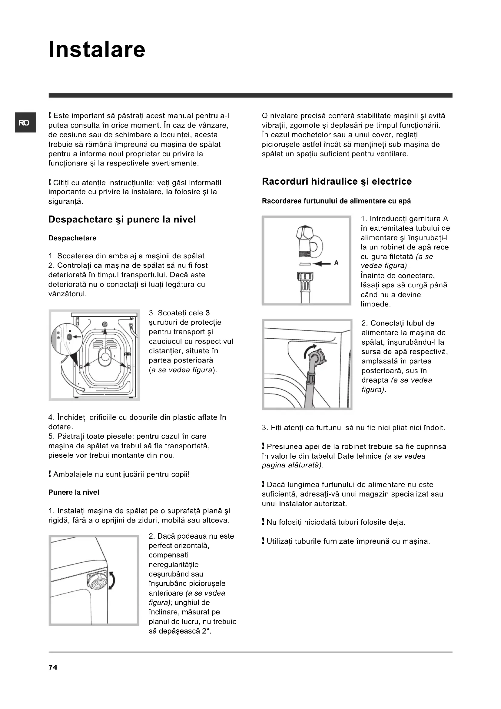 Instalare Este important sã pãstraþi acest manual pentru a-l putea consulta în orice moment. În caz de vânzare, de cesiune sau de schimbare a locuinþei, acesta trebuie sã rãmânã împreunã cu maºina de spãlat pentru a informa noul proprietar cu privire la funcþionare ºi la respectivele avertismente. Citiþi cu atenþie instrucþiunile: veþi gãsi informaþii importante cu privire la instalare, la folosire ºi la siguranþã. Despachetare ºi punere la nivel Despachetare