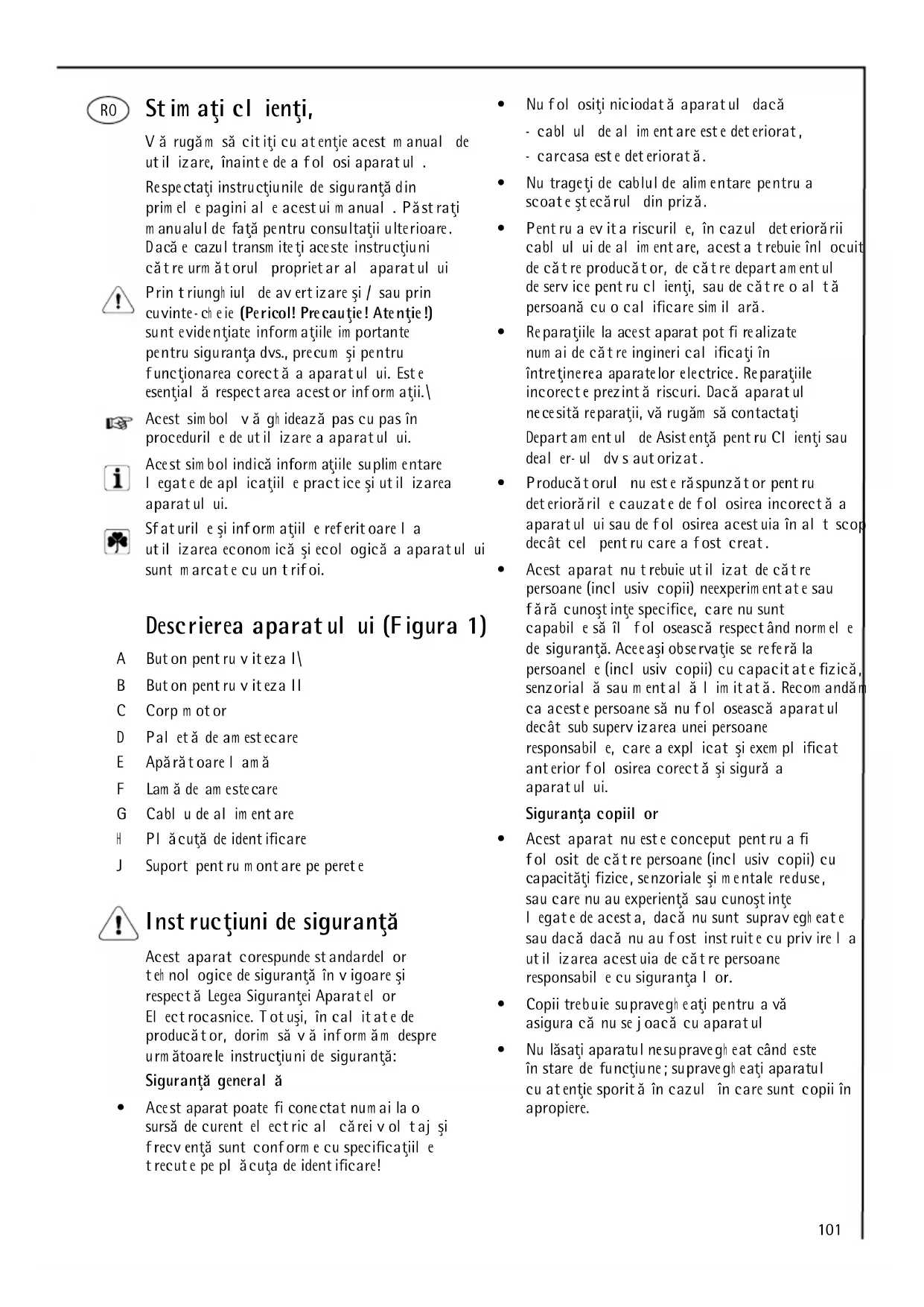 - EM C direk tiva 89 /336/EEC sa am adm anim a 9 2/31/EEC i 9 3/68/EEC101 Stim aţi clienţi, Vă rugăm să citiţi cu atenţie acest m anual de utilizare, înainte de a folosi aparatul. Respectaţi instrucţiunile de siguranţă din prim ele pagini ale acestui m anual. Păstraţi m anualul de faţă pentru consultaţii ulterioare. Dacă e cazul transm iteţi aceste instrucţiuni către urm ătorul proprietar al aparatului Prin triungh iul de avertizare şi / sau prin cuvinte- ch eie (Pericol! Precauţie! Atenţie!) sunt evidenţiate inform aţiile im portante pentru siguranţa dvs., precum şi pentru funcţionarea corectă a aparatului. Este esenţială respectarea acestor inform aţii.\ Acest sim bol vă gh idează pas cu pas în procedurile de utilizare a aparatului. Acest sim bol indică inform aţiile suplim entare legate de aplicaţiile practice şi utilizarea aparatului. Sfaturile şi inform aţiile referitoare la utilizarea econom ică şi ecologică a aparatului sunt m arcate cu un trifoi. Descrierea aparatului (Figura 1) A Buton pentru viteza I\ B Buton pentru viteza II C Corp m otor D Paletă de am estecare E Apărătoare lam ă F Lam ă de am estecare G Cablu de alim entare H Plăcuţă de identificare J Suport pentru m ontare pe perete Instrucţiuni de siguranţă Acest aparat corespunde standardelor teh nologice de siguranţă în vigoare şi respectă Legea Siguranţei Aparatelor Electrocasnice. Totuşi, în calitate de producător, dorim să vă inform ăm despre urm ătoarele instrucţiuni de siguranţă: Siguranţă generală