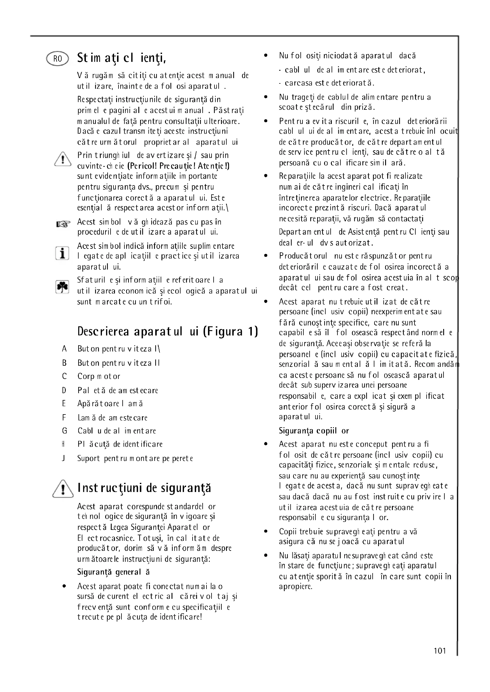 - EM C direk tiva 89 /336/EEC sa am adm anim a 9 2/31/EEC i 9 3/68/EEC101 Stim aţi clienţi, Vă rugăm să citiţi cu atenţie acest m anual de utilizare, înainte de a folosi aparatul. Respectaţi instrucţiunile de siguranţă din prim ele pagini ale acestui m anual. Păstraţi m anualul de faţă pentru consultaţii ulterioare. Dacă e cazul transm iteţi aceste instrucţiuni către urm ătorul proprietar al aparatului Prin triungh iul de avertizare şi / sau prin cuvinte- ch eie (Pericol! Precauţie! Atenţie!) sunt evidenţiate inform aţiile im portante pentru siguranţa dvs., precum şi pentru funcţionarea corectă a aparatului. Este esenţială respectarea acestor inform aţii.\ Acest sim bol vă gh idează pas cu pas în procedurile de utilizare a aparatului. Acest sim bol indică inform aţiile suplim entare legate de aplicaţiile practice şi utilizarea aparatului. Sfaturile şi inform aţiile referitoare la utilizarea econom ică şi ecologică a aparatului sunt m arcate cu un trifoi. Descrierea aparatului (Figura 1) A Buton pentru viteza I\ B Buton pentru viteza II C Corp m otor D Paletă de am estecare E Apărătoare lam ă F Lam ă de am estecare G Cablu de alim entare H Plăcuţă de identificare J Suport pentru m ontare pe perete Instrucţiuni de siguranţă Acest aparat corespunde standardelor teh nologice de siguranţă în vigoare şi respectă Legea Siguranţei Aparatelor Electrocasnice. Totuşi, în calitate de producător, dorim să vă inform ăm despre urm ătoarele instrucţiuni de siguranţă: Siguranţă generală