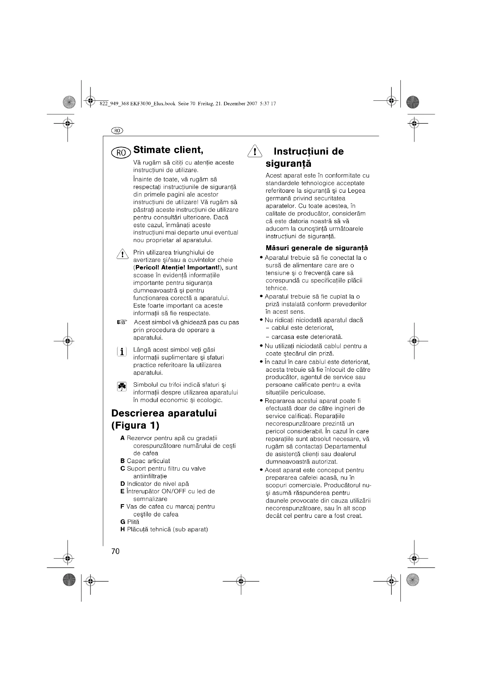 Stimate client, Vã rugãm sã citiþi cu atenþie aceste instrucþiuni de utilizare.Înainte de toate, vã rugãm sã respectaþi instrucþiunile de siguranþã din primele pagini ale acestor instrucþiuni de utilizare! Vã rugãm sã pãstraþi aceste instrucþiuni de utilizare pentru consultãri ulterioare. Dacã este cazul, înmânaþi aceste instrucþiuni mai departe unui eventual nou proprietar al aparatului. Prin utilizarea triunghiului de avertizare ºi/sau a cuvintelor cheie (Pericol! Atenþie! Important!), sunt scoase în evidenþã informaþiile importante pentru siguranþa dumneavoastrã ºi pentru funcþionarea corectã a aparatului. Este foarte important ca aceste informaþii sã fie respectate.0 Acest simbol vã ghideazã pas cu pas prin procedura de operare a aparatului. Lângã acest simbol veþi gãsi informaþii suplimentare ºi sfaturi practice referitoare la utilizarea aparatului. Simbolul cu trifoi indicã sfaturi ºi informaþii despre utilizarea aparatului în modul economic ºi ecologic. Descrierea aparatului (Figura 1) A Rezervor pentru apã cu gradaþii corespunzãtoare numãrului de ceºti de cafeaB Capac articulatC Suport pentru filtru cu valve antiinfiltraþieD Indicator de nivel apãE Întrerupãtor ON/OFF cu led de semnalizareF Vas de cafea cu marcaj pentru ceºtile de cafeaG PlitãH Plãcuþã tehnicã (sub aparat) 1 Instrucþiuni de siguranþã Acest aparat este în conformitate cu standardele tehnologice acceptate referitoare la siguranþã ºi cu Legea germanã privind securitatea aparatelor. Cu toate acestea, în calitate de producãtor, considerãm cã este datoria noastrã sã vã aducem la cunoºtinþã urmãtoarele instrucþiuni de siguranþã.Mãsuri generale de siguranþã• Aparatul trebuie sã fie conectat la o sursã de alimentare care are o tensiune ºi o frecvenþã care sã corespundã cu specificaþiile plãcii tehnice.• Aparatul trebuie sã fie cuplat la o prizã instalatã conform prevederilor în acest sens.• Nu ridicaþi niciodatã aparatul dacã– cablul este deteriorat,– carcasa este deterioratã.• Nu utilizaþi niciodatã cablul pentru a coate ºtecãrul din prizã.• În cazul în care cablul este deteriorat, acesta trebuie sã fie înlocuit de cãtre producãtor, agentul de service sau persoane calificate pentru a evita situaþiile periculoase.• Repararea acestui aparat poate fi efectuatã doar de cãtre ingineri de service calificaþi. Reparaþiile necorespunzãtoare prezintã un pericol considerabil. În cazul în care reparaþiile sunt absolut necesare, vã rugãm sã contactaþi Departamentul de asistenþã clienþi sau dealerul dumneavoastrã autorizat.• Acest aparat este conceput pentru prepararea cafelei acasã, nu în scopuri comerciale. Producãtorul nu-ºi asumã rãspunderea pentru daunele provocate din cauza utilizãrii necorespunzãtoare, sau în alt scop decât cel pentru care a fost creat.822_949_368 EKF3030_Elux.book Seite 70 Freitag, 21. Dezember 2007 5:37 17z