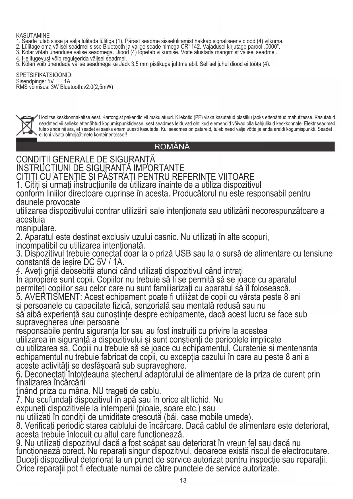 acesta trebuie înlocuit cu altul care funcționează. nu utilizați în condiții de umiditate crescută (băi, case mobile umede). expuneți dispozitivele la intemperii (ploaie, soare etc.) sau14 Putere RMS: 3W Bluetooth: v2.0 (2,5mW) Tensiune de intrare: 5V 1A SPECIFICAȚII: 5. Difuzorul poate fi conectat la un dispozitiv extern, de asemenea, cu ajutorul unui cablu cu fişă de tip Jack de 3,5 mm. În acest caz nu va funcţiona dioda (4).
