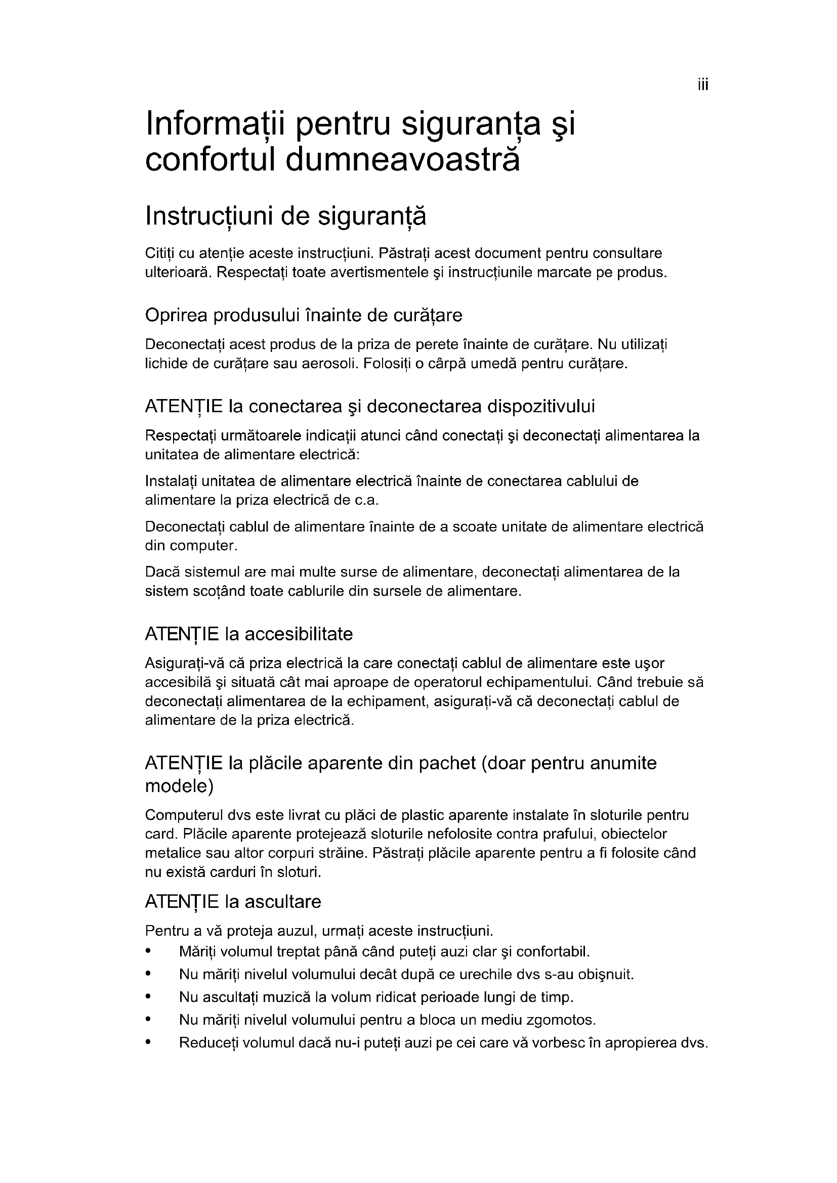 zaporka . . . . . . . . . . . . . . . . . . . . . 19 vrste . . . . . . . . . . . . . . . . . . . 19 zvučnici rješavanje problema . . . . . . . . 9Seria Aspire One Ghidul general de utilizareNumărul modelului: _____________________________ Numărul seriei: ________________________________ Data achiziţiei: _________________________________ Locul achiziţiei: ________________________________ © 2010 Toate drepturile rezervate Ghidul general de utilizare seria Aspire One Prima ediţie: 06/2010 Computer portabil seria Aspire Oneiii Informaţii pentru siguranţa şi confortul dumneavoastră Instrucţiuni de siguranţă Citiţi cu atenţie aceste instrucţiuni. Păstraţi acest document pentru consultare ulterioară. Respectaţi toate avertismentele şi instrucţiunile marcate pe produs. Oprirea produsului înainte de curăţare Deconectaţi acest produs de la priza de perete înainte de curăţare. Nu utilizaţi lichide de curăţare sau aerosoli. Folosiţi o cârpă umedă pentru curăţare. ATENıIE la conectarea şi deconectarea dispozitivului Respectaţi următoarele indicaţii atunci când conectaţi şi deconectaţi alimentarea la unitatea de alimentare electrică: Instalaţi unitatea de alimentare electrică înainte de conectarea cablului de alimentare la priza electrică de c.a. Deconectaţi cablul de alimentare înainte de a scoate unitate de alimentare electrică din computer. Dacă sistemul are mai multe surse de alimentare, deconectaţi alimentarea de la sistem scoţând toate cablurile din sursele de alimentare. ATENıIE la accesibilitate Asiguraţi-vă că priza electrică la care conectaţi cablul de alimentare este uşor accesibilă şi situată cât mai aproape de operatorul echipamentului. Când trebuie să deconectaţi alimentarea de la echipament, asiguraţi-vă că deconectaţi cablul de alimentare de la priza electrică. ATENıIE la plăcile aparente din pachet (doar pentru anumite modele) Computerul dvs este livrat cu plăci de plastic aparente instalate în sloturile pentru card. Plăcile aparente protejează sloturile nefolosite contra prafului, obiectelor metalice sau altor corpuri străine. Păstraţi plăcile aparente pentru a fi folosite când nu există carduri în sloturi. ATENıIE la ascultare Pentru a vă proteja auzul, urmaţi aceste instrucţiuni.